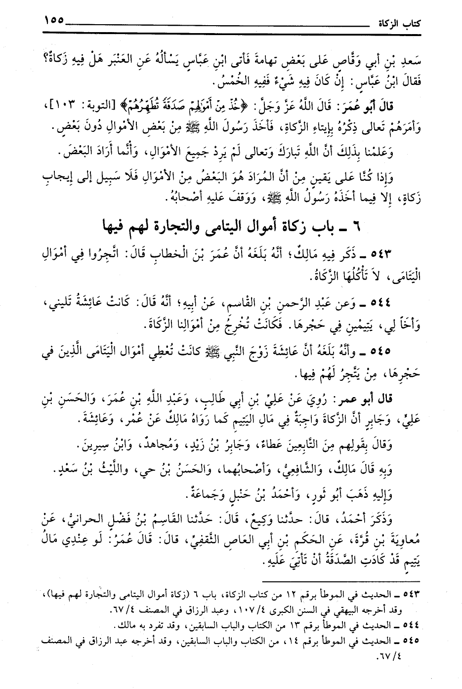 545 - وَأَنَّهُ بَلَغَهُ أَنَّ عَائِشَةَ زَوْجَ النَّبِيِّ صَلَّى اللَّهُ عَلَيْهِ وَسَلَّمَ كَانَتْ تُعْطِي أَمْوَالَ الْيَتَامَى الَّذِينَ فِي حَجْرِهَا مَنْ يَتَّجِرُ لَهُمْ فِيهَا