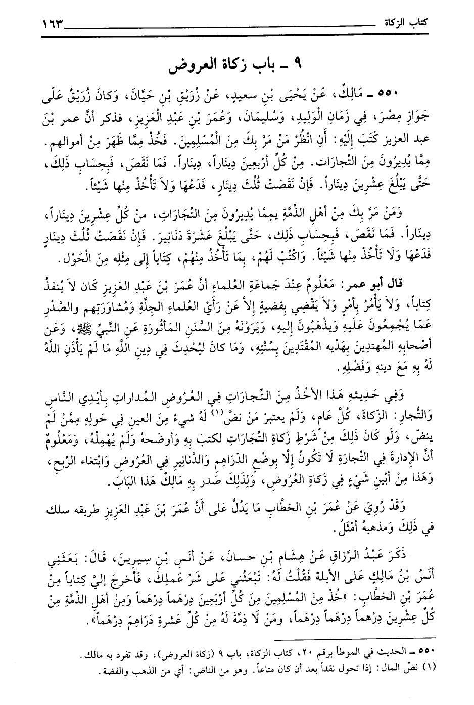 550 - مَالِكٌ عَنْ يَحْيَى بْنِ سَعِيدٍ عَنْ زُرَيْقِ بْنَ حَيَّانَ وَكَانَ زُرَيْقٌ عَلَى جَوَازِ مِصْرَ فِي زَمَانِ الْوَلِيدِ وَسُلَيْمَانَ وَعُمَرَ بْنِ عَبْدِ الْعَزِيزِ فَذَكَرَ أَنَّ عُمَرَ بْنَ عَبْدِ الْعَزِيزِ كَتَبَ إِلَيْهِ أَنِ انْظُرْ مَنْ مَرَّ بِكَ مِنَ الْمُسْلِمِينَ فَخُذْ مِمَّا ظهر من أَمْوَالِهِمْ مِمَّا يُدِيرُونَ مِنَ التِّجَارَاتِ مِنْ كُلِّ أَرْبَعِينَ دِينَارًا دِينَارًا فَمَا نَقَصَ فَبِحِسَابِ ذَلِكَ حَتَّى يَبْلُغَ عِشْرِينَ دِينَارًا فَإِنْ نَقَصَتْ ثُلُثَ دِينَارٍ فَدَعْهَا وَلَا تَأْخُذُ مِنْهَا شَيْئًا