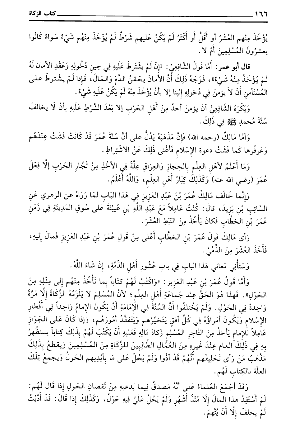 وَمَا أَعْلَمُ لِأَهْلِ الْعِلْمِ بِالْحِجَازِ وَالْعِرَاقِ عِلَّةً فِي الْأَخْذِ مِنْ تُجَّارِ الْحَرْبِ إِلَّا فِعْلَ عُمَرَ (رَضِيَ اللَّهُ عَنْهُ) وَكَذَلِكَ كِبَارُ أَهْلِ الْعِلْمِ وَاللَّهُ أَعْلَمُ