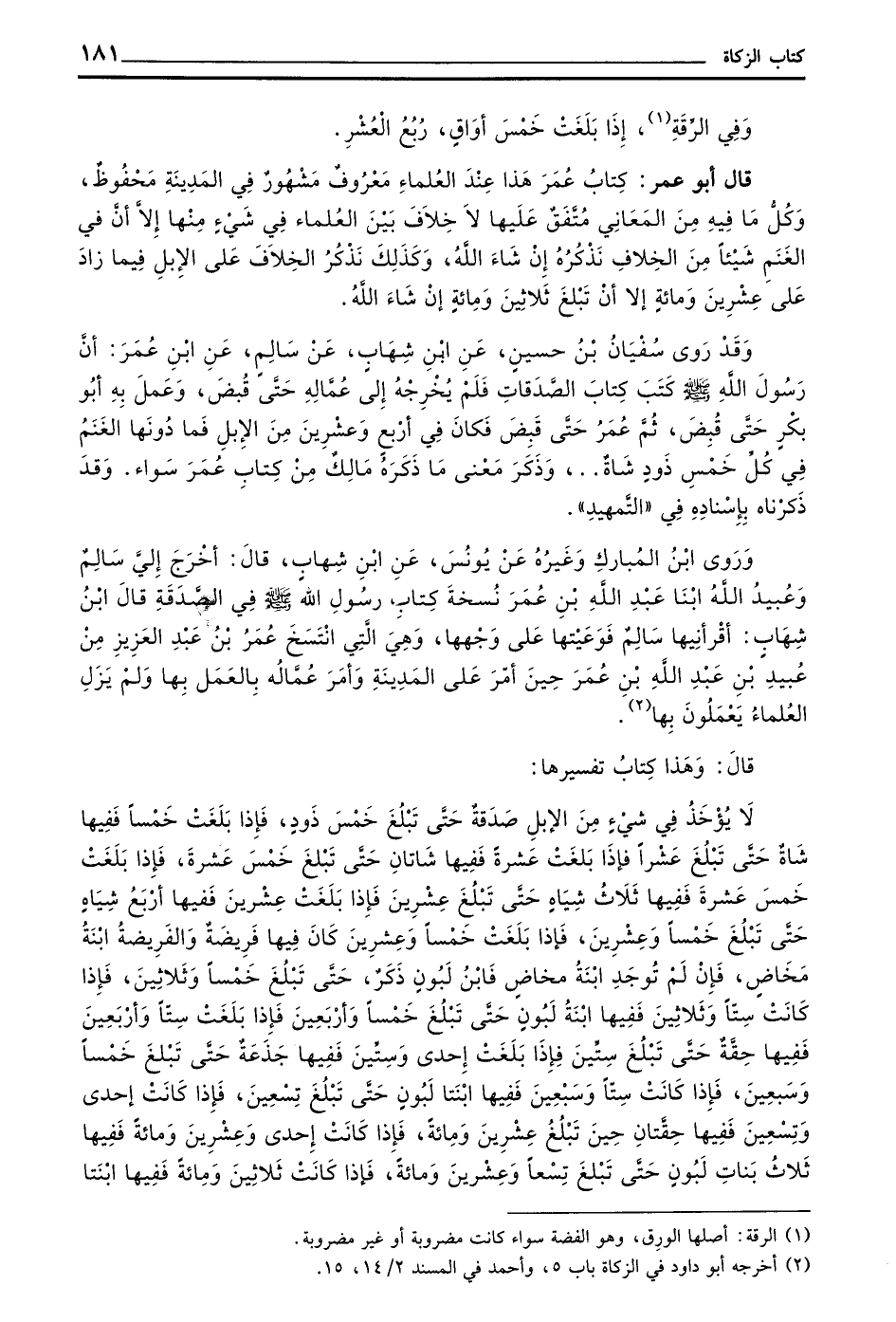 قَالَ أَبُو عُمَرَ كِتَابُ عُمَرَ هَذَا عِنْدَ الْعُلَمَاءِ مَعْرُوفٌ مَشْهُورٌ فِي الْمَدِينَةِ مَحْفُوظٌ وَكُلُّ مَا فِيهِ مِنَ الْمَعَانِي مُتَّفَقٌ عَلَيْهَا لَا خِلَافَ بَيْنَ الْعُلَمَاءِ فِي شَيْءٍ مِنْهَا إِلَّا أَنَّ فِي الْغَنَمِ شَيْئًا مِنَ الْخِلَافِ نَذْكُرَهُ إِنْ شَاءَ اللَّهُ وَكَذَلِكَ نَذْكُرُ الْخِلَافَ عَلَى الْإِبِلِ فِيمَا زَادَ عَلَى عِشْرِينَ وَمِائَةٍ إِلَّا أَنْ تَبْلُغَ ثَلَاثِينَ وَمِائَةٍ إِنْ شَاءَ اللَّهُ