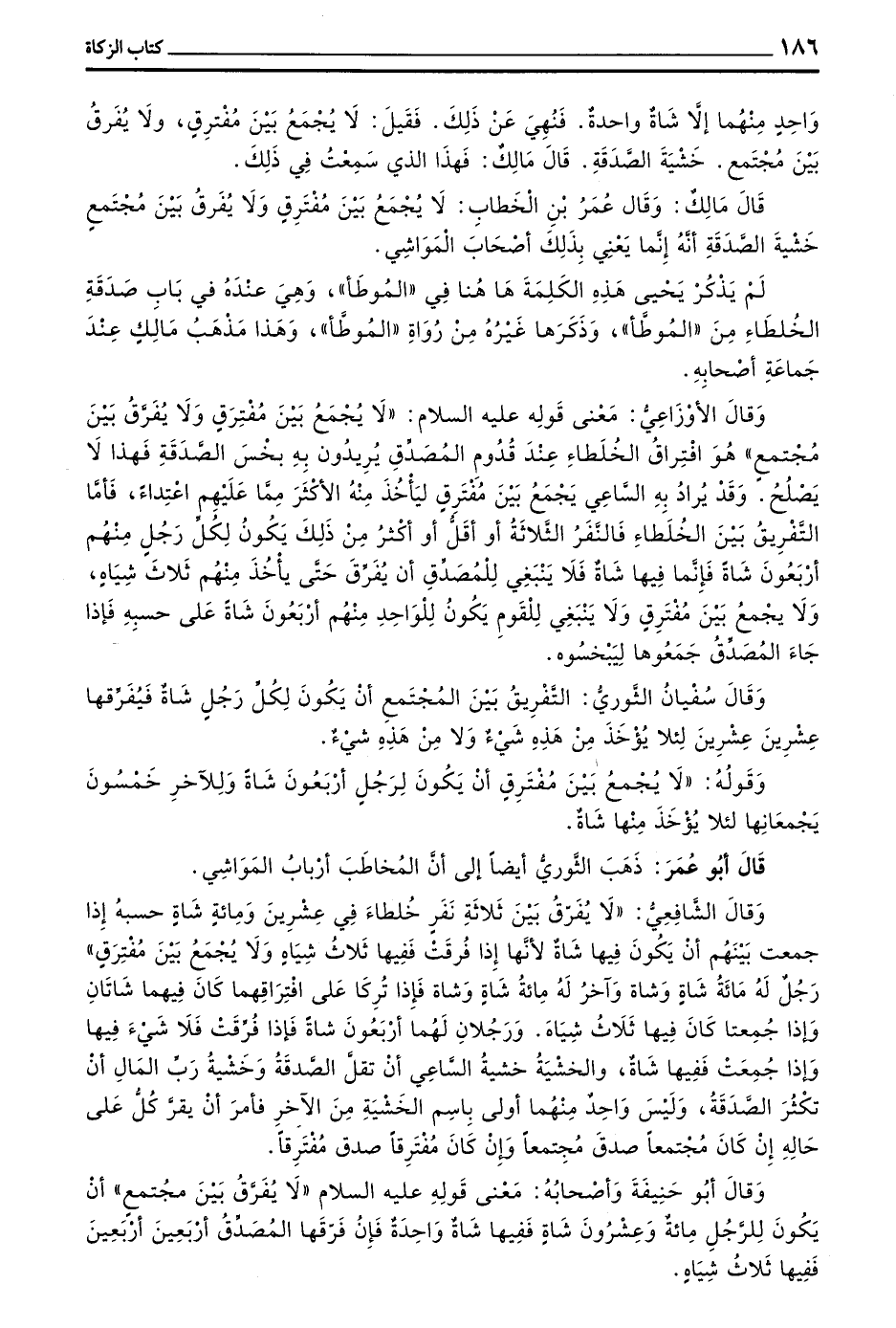 قَالَ مَالِكٌ وَقَالَ عُمَرُ بْنُ الْخَطَّابِ لَا يُجْمَعُ بَيْنَ مُفْتَرِقٍ وَلَا يُفَرَّقُ بَيْنَ مُجْتَمِعٍ خَشْيَةَ الصَّدَقَةِ أَنَّهُ إِنَّمَا يَعْنِي بِذَلِكَ أَصْحَابَ الْمَوَاشِي