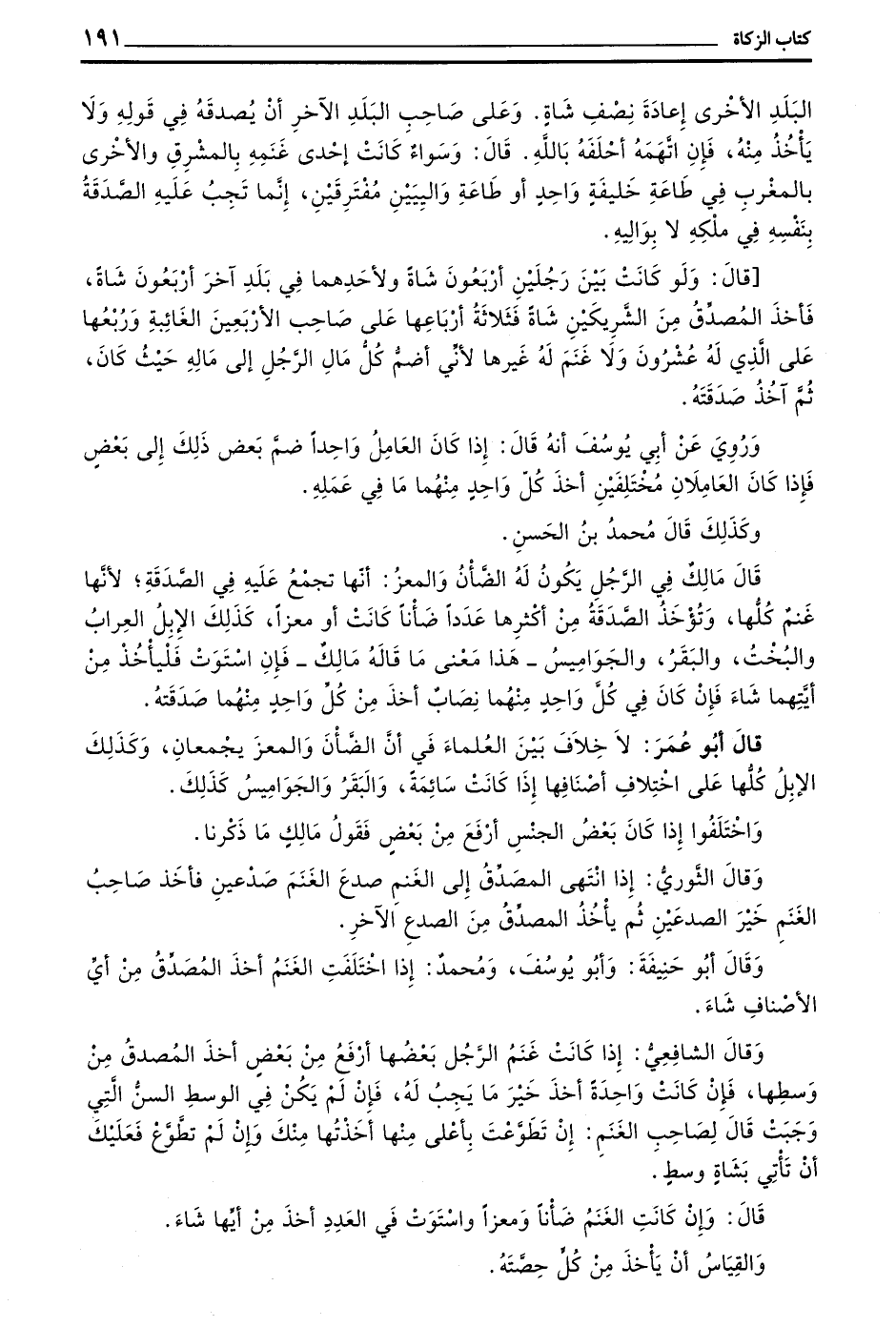 قَالَ أَبُو عُمَرَ لَا خِلَافَ بَيْنَ الْعُلَمَاءِ فِي أَنَّ الضَّأْنَ وَالْمُعْزَ يُجْمَعَانِ وَكَذَلِكَ الْإِبِلُ كُلُّهَا عَلَى اخْتِلَافِ أَصْنَافِهَا إِذَا كَانَتْ سَائِمَةً وَالْبَقَرُ وَالْجَوَامِيسُ كَذَلِكَ