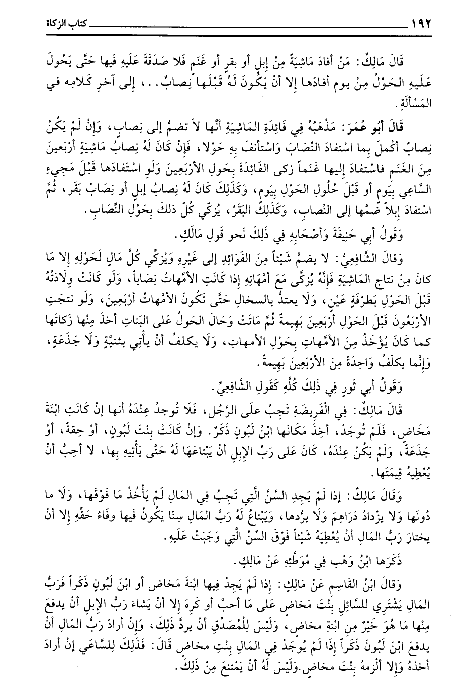 قَالَ أَبُو عُمَرَ مَذْهَبُهُ فِي فَائِدَةِ الْمَاشِيَةِ أَنَّهَا لَا تُضَمُّ إِلَى نِصَابٍ وَإِنْ لَمْ يَكُنْ نِصَابٌ أَكْمَلَ بِمَا اسْتَفَادَ النِّصَابَ وَاسْتَأْنَفَ بِهِ حَوْلًا فَإِنْ كَانَ لَهُ نِصَابُ مَاشِيَةٍ أَرْبَعِينَ مِنَ الْغَنَمِ فَاسْتَفَادَ إِلَيْهَا غَنَمًا زَكَّى الْفَائِدَةَ بِحَوْلِ الْأَرْبَعِينَ وَلَوِ اسْتَفَادَهَا قَبْلَ مَجِيءِ السَّاعِي بِيَوْمٍ أو قبل حلول الحول بيوم وكذلك كَانَ لَهُ نِصَابُ إِبِلٍ أَوْ نِصَابُ بَقَرٍ ثُمَّ اسْتَفَادَ إِبِلًا ضَمَّهَا إِلَى النِّصَابِ وَكَذَلِكَ الْبَقَرُ يُزَكِّي كُلَّ ذَلِكَ بِحَوْلِ النِّصَابِ