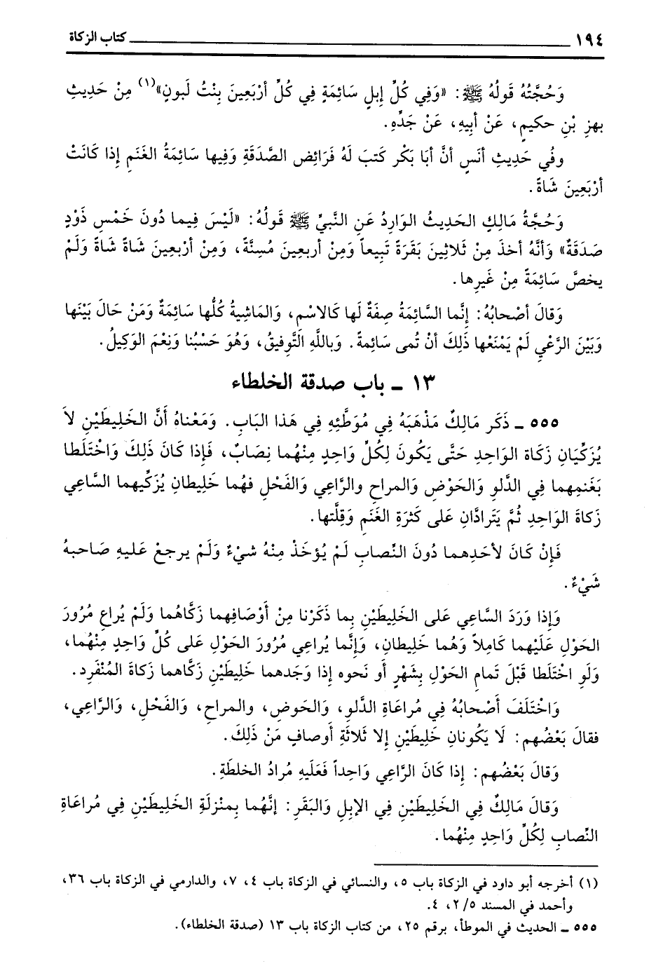 555 - ذَكَرَ مَالِكٌ مَذْهَبَهُ فِي مُوَطَّئِهِ فِي هَذَا الْبَابِ وَمَعْنَاهُ أَنَّ الْخَلِيطَيْنِ لَا يُزَكِّيَانِ زَكَاةَ الْوَاحِدِ حَتَّى يَكَوَنَ لِكُلِّ وَاحِدٍ مِنْهُمَا نِصَابٌ فَإِذَا كَانَ ذَلِكَ وَاخْتَلَطَا بِغَنَمِهِمَا فِي الدَّلْوِ وَالْحَوْضِ وَالْمُرَاحِ وَالرَّاعِي وَالْفَحْلِ فَهُمَا خَلِيطَانِ يُزَكِّيهِمَا السَّاعِي زَكَاةَ الْوَاحِدِ ثُمَّ يَتَرَادَّانِ عَلَى كَثْرَةِ الْغَنَمِ وَقِلَّتِهَا