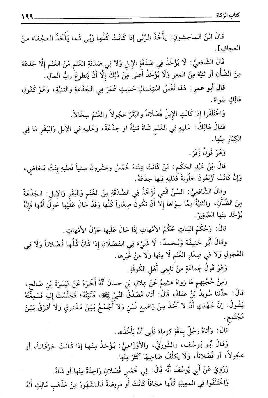 وَقَالَ الشَّافِعِيُّ السِّنُّ الَّتِي تُؤْخَذُ فِي الصَّدَقَةِ مِنَ الْغَنَمِ وَالْبَقَرِ وَالْإِبِلِ الْجَذَعَةُ مِنَ الضَّأْنِ وَالثَّنِيَّةُ مِمَّا سِوَاهَا إِلَّا أَنْ تَكُونَ صِغَارًا كُلُّهَا وَقَدْ حَالَ عَلَيْهَا حَوْلُ أُمِّهَا فَإِنَّهُ يُؤْخَذُ مِنْهَا الصَّغِيرُ