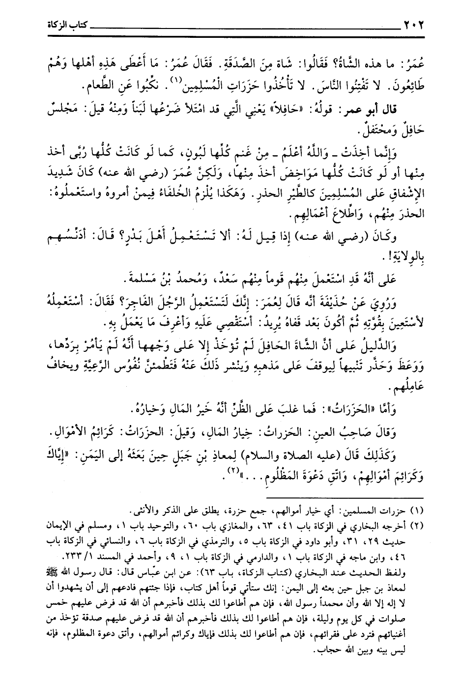عُمَرُ مَا هَذِهِ الشَّاةُ فَقَالُوا شَاةٌ مِنَ الصَّدَقَةِ فَقَالَ عُمَرُ مَا أَعْطَى هَذِهِ أَهْلُهَا وَهُمْ طَائِعُونَ لَا تَفْتِنُوا النَّاسَ لَا تَأْخُذُوا حَزَرَاتِ الْمُسْلِمِينَ نَكِّبُوا عَنِ الطَّعَامِ