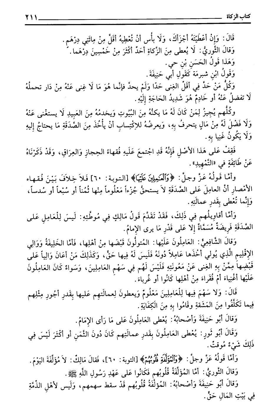 وأما قوله عز وجل (والعاملين عليها) التَّوْبَةِ 60 فَلَا خِلَافَ بَيْنِ فُقَهَاءِ الْأَمْصَارِ أَنَّ الْعَامِلَ عَلَى الصَّدَقَةِ لَا يَسْتَحِقُّ جُزْءًا مَعْلُومًا مِنْهَا ثُمُنًا أَوْ سُبُعًا أَوْ سُدُسًا وَإِنَّمَا تعطى بِقَدْرِ عَمَالَتِهِ