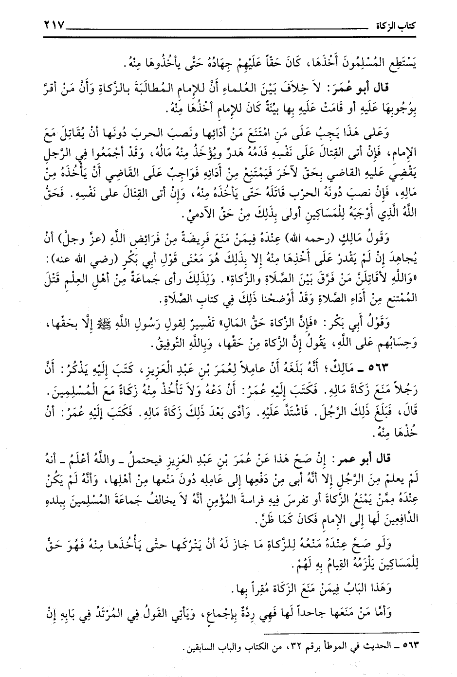 وَقَوْلُ مَالِكٍ (رَحِمَهُ اللَّهُ) عِنْدَهُ فِيمَنْ مَنَعَ فَرِيضَةً مِنْ فَرَائِضِ اللَّهِ (عَزَّ وَجَلَّ) أَنْ يُجَاهِدَ إِنْ لَمْ يَقْدِرْ عَلَى أَخْذِهَا مِنْهُ إِلَّا بِذَلِكَ هُوَ مَعْنَى قَوْلِ أَبِي بَكْرٍ (رَضِيَ اللَّهُ عَنْهُ) وَاللَّهِ لَأُقَاتِلَنَّ مَنْ فَرَّقَ بَيْنَ الصَّلَاةِ وَالزَّكَاةِ وَلِذَلِكَ رَأَى جَمَاعَةٌ مِنْ أَهْلِ الْعِلْمِ قَتْلَ الْمُمْتَنِعِ مِنْ أَدَاءِ الصَّلَاةِ وَقَدْ أَوْضَحْنَا ذَلِكَ فِي كِتَابِ الصَّلَاةِ