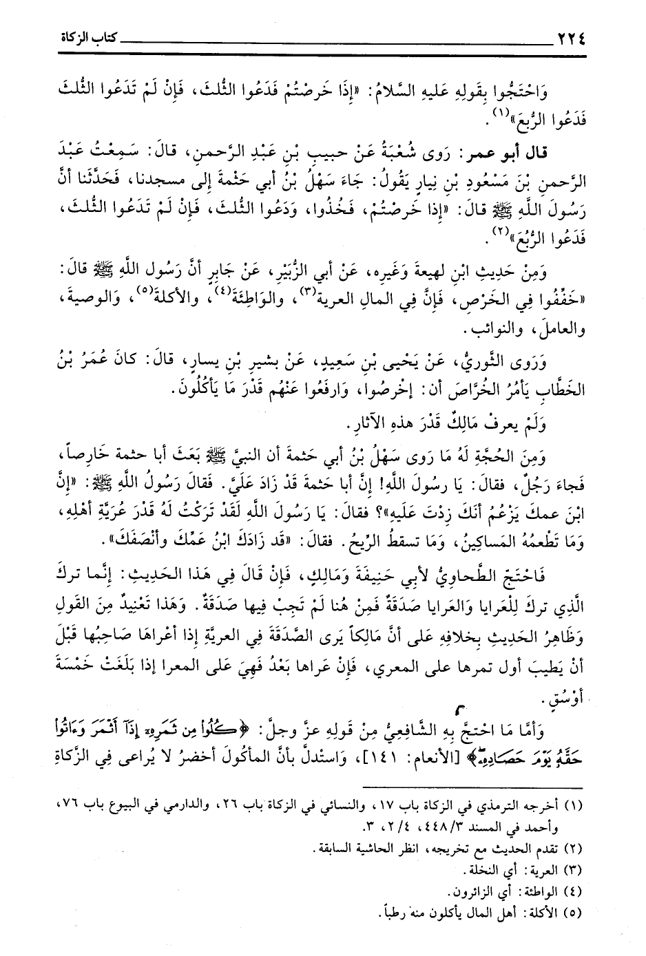 فَاحْتَجَّ الطَّحَاوِيُّ لِأَبِي حَنِيفَةَ وَمَالِكٍ فَإِنْ قَالَ فِي هَذَا الْحَدِيثِ إِنَّمَا تَرَكَ الَّذِي تَرَكَ لِلْعَرَايَا وَالْعَرَايَا صَدَقَةٌ فَمِنْ هُنَا لَمْ تَجِبْ فِيهَا صَدَقَةٌ وَهَذَا تَعْنِيدٌ مِنَ الْقَوْلِ وَظَاهِرُ الْحَدِيثِ بِخِلَافِهِ عَلَى أَنَّ مَالِكًا يَرَى الصَّدَقَةَ فِي الْعَرِيَّةِ إِذَا أَعْرَاهَا صَاحِبُهَا قَبْلَ أَنْ يَطِيبَ أَوَّلُ تَمْرِهَا عَلَى الْمُعْرِي فإن عراها بعد فهي على المعرا إِذَا بَلَغَتْ خَمْسَةَ أَوْسُقٍ