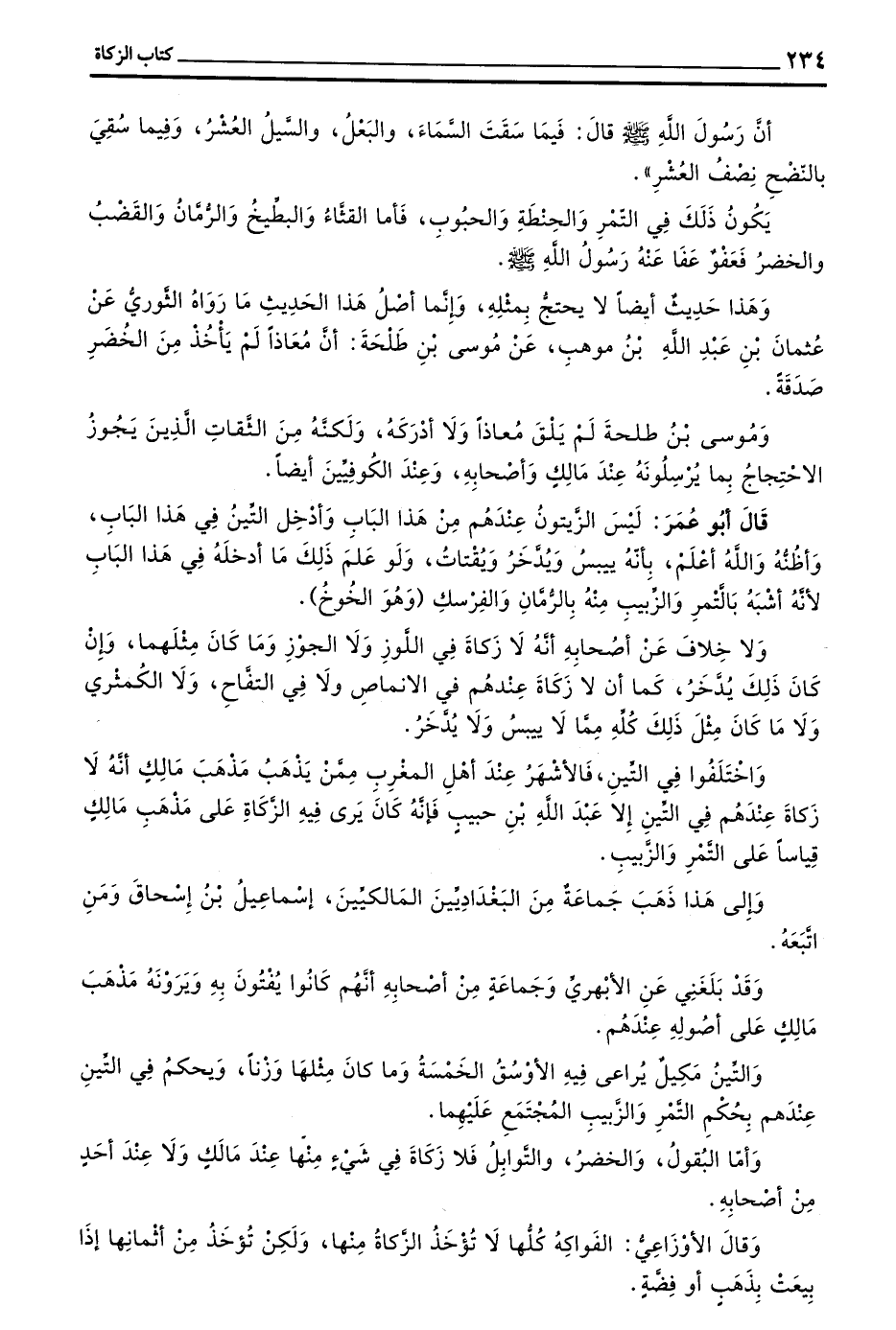 وَاخْتَلَفُوا فِي التِّينِ فَالْأَشْهُرُ عِنْدَ أَهْلِ الْمَغْرِبِ مِمَّنْ يَذْهَبُ مَذْهَبَ مَالِكٍ أَنَّهُ لَا زَكَاةَ عِنْدَهُمْ فِي التِّينِ إِلَّا عَبْدَ اللَّهِ بْنَ حَبِيبٍ فَإِنَّهُ كَانَ يَرَى فِيهِ الزَّكَاةَ عَلَى مَذْهَبِ مَالِكٍ قِيَاسًا عَلَى التَّمْرِ وَالزَّبِيبِ
