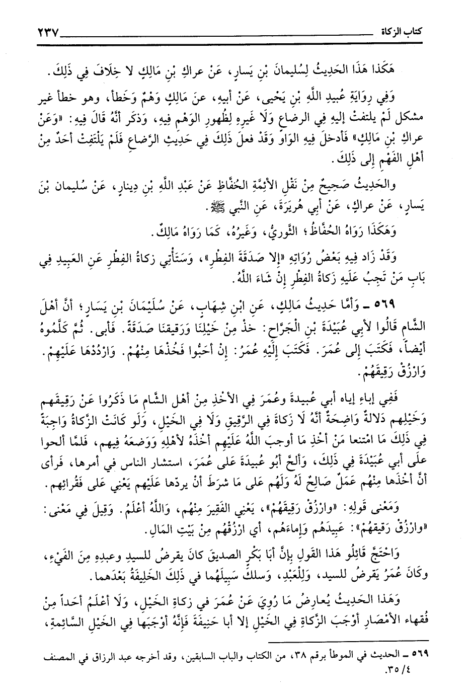 569 - وَأَمَّا حَدِيثُ مَالِكٍ عَنْ بن شهاب عن سليمان بْنِ يَسَارٍ أَنَّ أَهْلَ الشَّامِ قَالُوا لِأَبِي عُبَيْدَةَ بْنِ الْجَرَّاحَ خُذْ مِنْ خَيْلِنَا وَرَقِيقِنَا صَدَقَةً فَأَبَى ثُمَّ كَلَّمُوهُ أَيْضًا فَكَتَبَ إِلَى عُمَرَ فَكَتَبَ إِلَيْهِ عُمَرُ إِنْ أَحَبُّوا فَخُذْهَا منهم وارددها عليهم وارزق رقيقهم