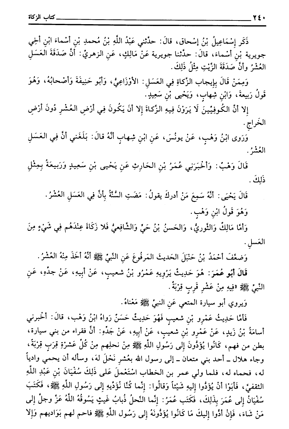 فَأَمَّا حَدِيثُ عَمْرِو بْنِ شعيب فهو حديث حسن رواه بن وَهْبٍ قَالَ أَخْبَرَنِي أُسَامَةُ بْنُ زَيْدٍ عَنْ عَمْرِو بْنِ شُعَيْبٍ عَنْ أَبِيهِ عَنْ جده أَنَّ فُقَرَاءَ مَنْ بَنِي سَيَّارَةَ بَطْنٍ مَنْ فَهْمٍ كَانُوا يُؤَدُّونَ إِلَى رَسُولِ اللَّهِ صَلَّى اللَّهُ عَلَيْهِ وَسَلَّمَ مِنْ نَحْلِهِمْ مِنْ كُلِّ عَشَرَةِ قِرَبٍ قِرْبَةً وَجَاءَ هِلَالٌ - أَحَدُ بَنِي متعان - إلى رسول الله بِعُشْرِ نَحْلٍ لَهُ وَسَأَلَهُ أَنْ يَحْمِيَ وَادِيًا لَهُ فَحَمَاهُ لَهُ فَلَمَّا وَلِيَ عُمَرُ بْنُ الْخَطَّابِ اسْتَعْمَلَ عَلَى ذَلِكَ سُفْيَانَ بْنَ عَبْدِ اللَّهِ الثَّقَفِيَّ فَأَبَوْا أَنْ يُؤَدُّوا إِلَيْهِ شَيْئًا وَقَالُوا إِنَّمَا كُنَّا نُؤَدِّيهِ إِلَى رَسُولِ اللَّهِ صَلَّى اللَّهُ عَلَيْهِ وَسَلَّمَ فَكَتَبَ سُفْيَانُ إِلَى عُمَرَ بِذَلِكَ فَكَتَبَ عُمَرُ إِنَّمَا النَّحْلُ ذُبَابُ غَيْثٍ يَسُوقُهُ اللَّهُ عَزَّ وَجَلَّ إِلَى مَنْ شَاءَ فَإِنْ أَدَّوْا إِلَيْكَ مَا كَانُوا يُؤَدُّونَهُ إِلَى رَسُولِ اللَّهِ صَلَّى اللَّهُ عَلَيْهِ وَسَلَّمَ فَاحِمِ لَهُمْ بِوَادِيهِمْ وَإِلَّا