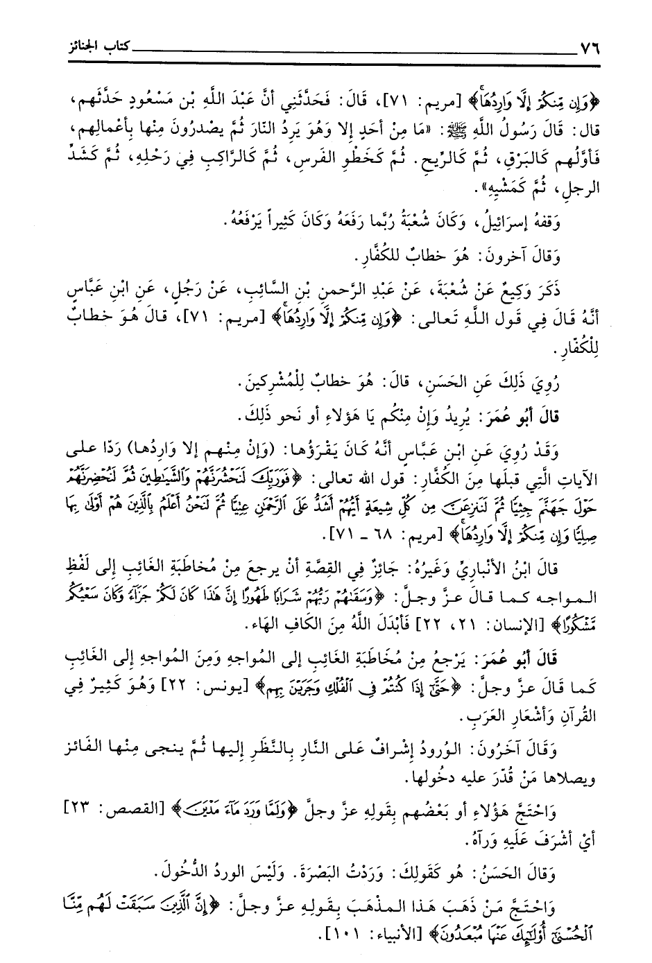 (وَإِنْ مِنْكُمْ إِلَّا وَارِدُهَا) مَرْيَمَ 71 قَالَ فَحَدَّثَنِي أَنَّ عَبْدَ اللَّهِ بْنَ مَسْعُودٍ حَدَّثَهُمْ قَالَ قَالَ رَسُولُ اللَّهِ صَلَّى اللَّهُ عَلَيْهِ وَسَلَّمَ مَا مِنْ أَحَدٍ إِلَّا وَهُوَ يَرِدُ النَّارَ ثُمَّ يَصْدُرُونَ مِنْهَا بِأَعْمَالِهِمْ فَأَوَّلُهُمْ كَالْبَرْقِ ثُمَّ كَالرِّيحِ ثُمَّ كَخَطْوِ الْفَرَسِ ثُمَّ كَالرَّاكِبِ فِي رَحْلِهِ ثُمَّ كَشَدِّ الرَّجُلِ ثُمَّ كَمَشْيِهِ