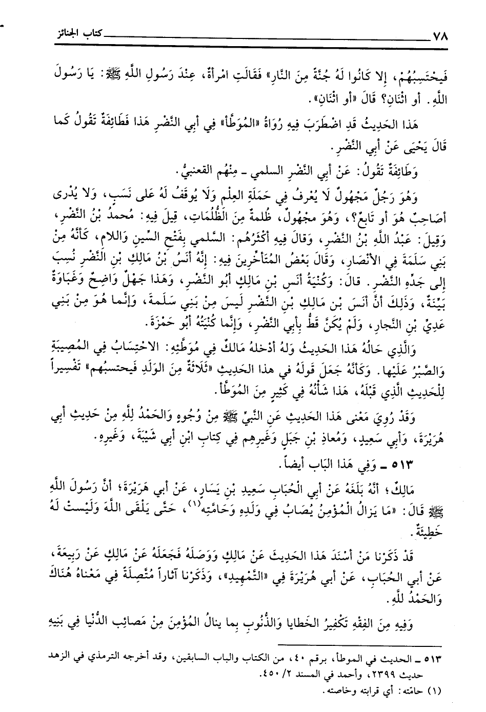 وَالَّذِي حَالُهُ هَذَا الْحَدِيثُ وَلَهُ أَدْخَلَهُ مَالِكٌ فِي مُوَطَّئِهِ الِاحْتِسَابُ فِي الْمُصِيبَةِ وَالصَّبْرُ عَلَيْهَا وَكَأَنَّهُ جَعَلَ قَوْلَهُ فِي هَذَا الْحَدِيثِ ثَلَاثَةٌ مِنَ الْوَلَدِ فَيَحْتَسِبُهُمْ تَفْسِيرًا لِلْحَدِيثِ الَّذِي قَبْلَهُ هَذَا شَأْنُهُ فِي كَثِيرٍ مِنَ الْمُوَطَّأِ