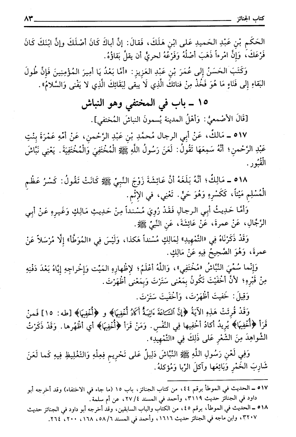 517 - مَالِكٌ عَنْ أَبِي الرِّجَالِ مُحَمَّدِ بْنِ عَبْدِ الرَّحْمَنِ عَنْ أُمِّهِ عُمْرَةَ بِنْتِ عَبْدِ الرَّحْمَنِ أنه سمعها تقول لَعَنَ رَسُولُ اللَّهِ صَلَّى اللَّهُ عَلَيْهِ وَسَلَّمَ الْمُخْتَفِيَ وَالْمُخْتَفِيَةَ يَعْنِي نَبَّاشَ الْقُبُورِ