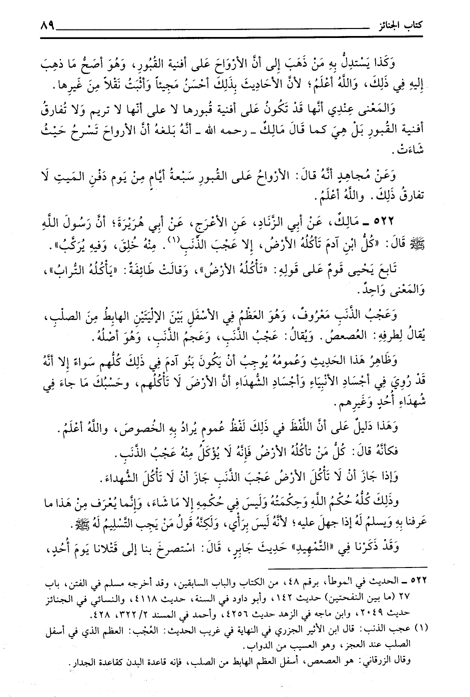 522 - مَالِكٌ عَنْ أَبِي الزِّنَادِ عَنِ الْأَعْرَجِ عَنْ أَبِي هُرَيْرَةَ أَنَّ رَسُولَ اللَّهِ صَلَّى اللَّهُ عليه وسلم قال كل بن آدَمَ تَأْكُلُهُ الْأَرْضُ إِلَّا عَجْبَ الذَّنَبِ مِنْهُ خُلِقَ وَفِيهِ يُرَكَّبُ