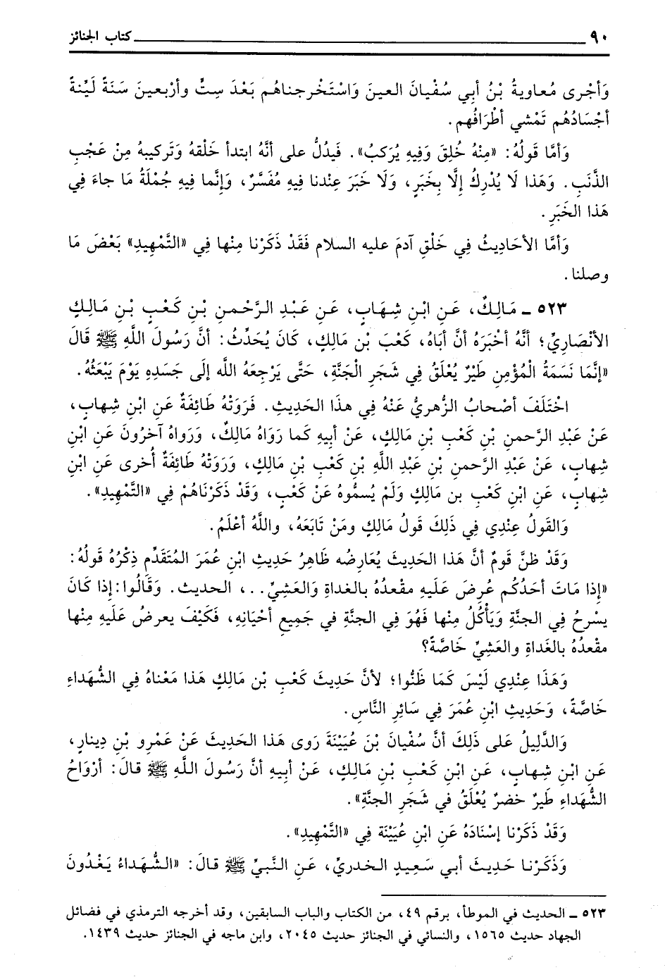 523 - مالك عن بن شِهَابٍ عَنْ عَبْدِ الرَّحْمَنِ بْنِ كَعْبِ بْنِ مَالِكٍ الْأَنْصَارِيِّ أَنَّهُ أَخْبَرَهُ أَنَّ أَبَاهُ كَعْبَ بْنَ مَالِكٍ كَانَ يُحَدِّثُ أَنَّ رَسُولَ اللَّهِ صَلَّى اللَّهُ عَلَيْهِ وَسَلَّمَ قَالَ إِنَّمَا نَسَمَةُ الْمُؤْمِنِ طَيْرٌ يُعَلَّقُ فِي شَجَرِ الْجَنَّةِ حَتَّى يُرْجِعَهُ اللَّهُ إِلَى جَسَدِهِ يَوْمَ يَبْعَثُهُ