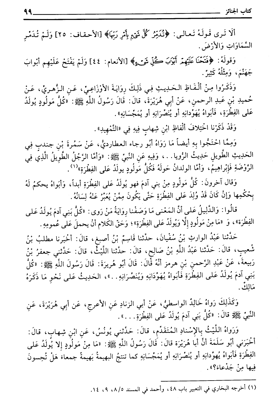 وَذَكَرُوا مِنْ أَلْفَاظِ الْحَدِيثِ فِي ذَلِكَ رِوَايَةَ الْأَوْزَاعِيِّ عَنِ الزُّهْرِيِّ عَنْ حُمَيْدِ بْنِ عَبْدِ الرَّحْمَنِ عَنْ أَبِي هُرَيْرَةَ قَالَ قَالَ رَسُولُ اللَّهِ صَلَّى اللَّهُ عَلَيْهِ وَسَلَّمَ كُلُّ مَوْلُودٍ يُولَدُ عَلَى الْفِطْرَةِ فَأَبَوَاهُ يُهَوِّدَانِهِ أَوْ يُنَصِّرَانِهِ أو يمجسانه