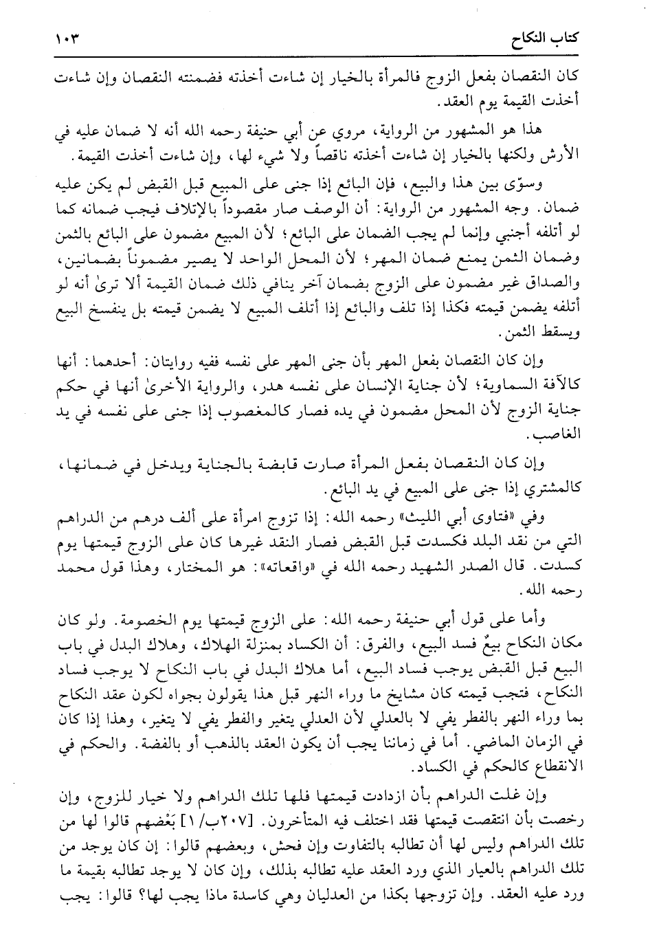 وأما على قول أبي حنيفة رحمه الله: على الزوج قيمتها يوم الخصومة. ولو كان مكان النكاح بيعٌ فسد البيع، والفرق: أن الكساد بمنزلة الهلاك، وهلاك البدل في باب البيع قبل القبض يوجب فساد البيع، أما هلاك البدل في باب النكاح لا يوجب فساد النكاح، فتجب قيمته كان مشايخ ما وراء النهر قبل هذا يقولون بجواه لكون عقد النكاح بما وراء النهر بالفطر يفي لا بالعدلي لأن العدلي يتغير والفطر يفي لا يتغير، وهذا إذا كان في الزمان الماضي. أما في زماننا يجب أن يكون العقد بالذهب أو بالفضة. والحكم في الانقطاع كالحكم في الكساد.