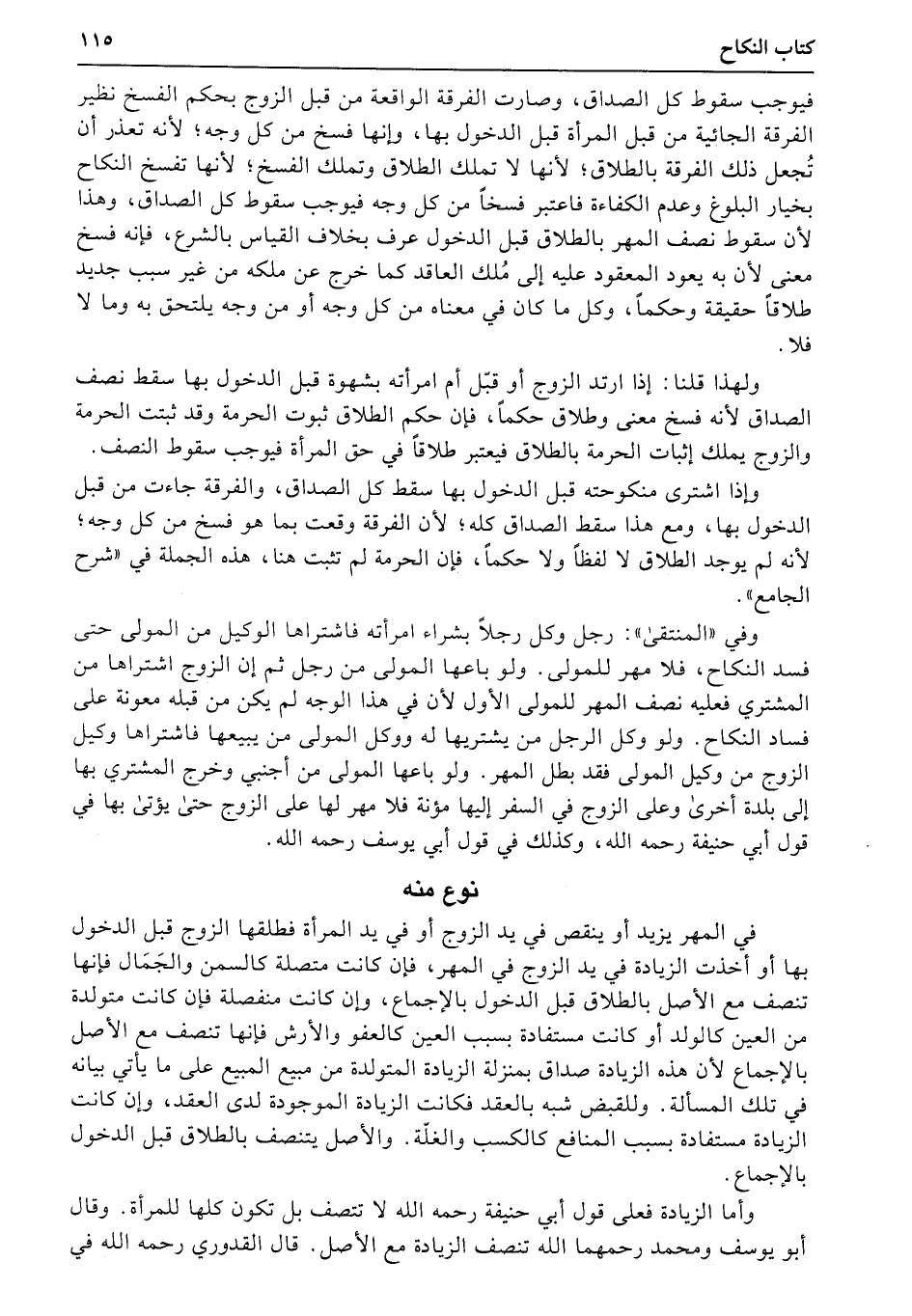 في المهر يزيد أو ينقص في يد الزوج أو في يد المرأة فطلقها الزوج قبل الدخول بها أو أخذت الزيادة في يد الزوج في المهر، فإن كانت متصلة كالسمن والجَمَال فإنها تنصف مع الأصل بالطلاق قبل الدخول بالإجماع، وإن كانت منفصلة فإن كانت متولدة من العين كالولد أو كانت مستفادة بسبب العين كالعفو والأرش فإنها تنصف مع الأصل بالإجماع لأن هذه الزيادة صداق بمنزلة الزيادة المتولدة من مبيع المبيع على ما يأتي بيانه في تلك المسألة. وللقبض شبه بالعقد فكانت الزيادة الموجودة لدى العقد، وإن كانت الزيادة مستفادة بسبب المنافع كالكسب والغلّة. والأصل يتنصف بالطلاق قبل الدخول بالإجماع.