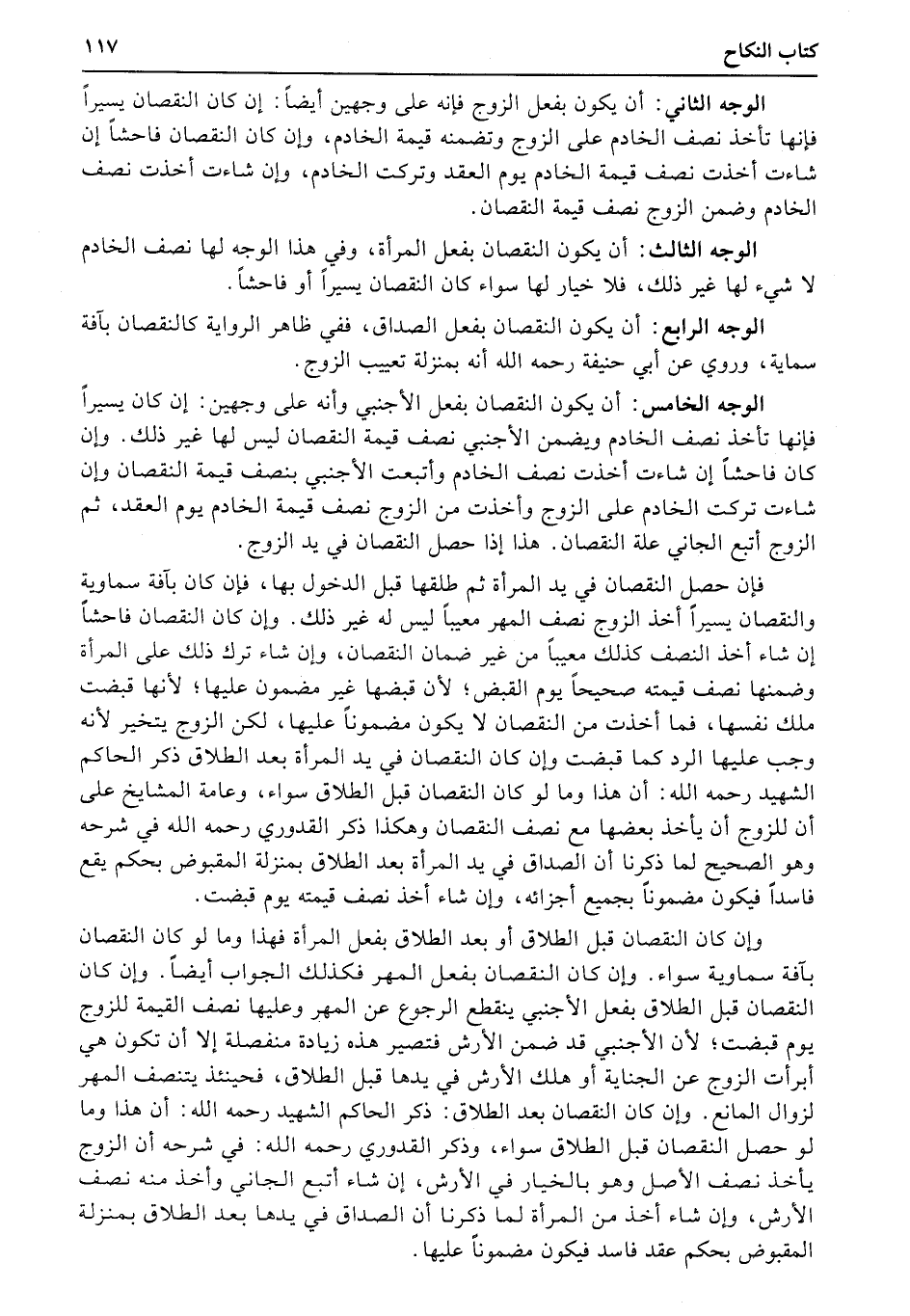 الوجه الخامس: أن يكون النقصان بفعل الأجنبي وأنه على وجهين: إن كان يسيراً فإنها تأخذ نصف الخادم ويضمن الأجنبي نصف قيمة النقصان ليس لها غير ذلك. وإن كان فاحشاً إن شاءت أخذت نصف الخادم وأتبعت الأجنبي بنصف قيمة النقصان وإن شاءت تركت الخادم على الزوج وأخذت من الزوج نصف قيمة الخادم يوم العقد، ثم الزوج أتبع الجاني علة النقصان. هذا إذا حصل النقصان في يد الزوج.