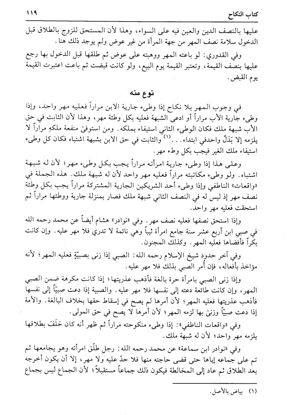 في وجوب المهر بلا نكاح إذا وطىء جارية الابن مراراً فعليه مهر واحد، وإذا وطىء جارية الأب مراراً أو ادعى الشبهة فعليه بكل وطئة مهر، وهذا لأن الثابت في حق الأب شبهة ملك فكان الوطىء الثاني استيفاء بملكه. ومن استوفى منفعة ملكهِ مراراً لا يلزمه إلا بَدَلٌ واحدفي ابتداء.... والثابت في حق الابن بشبهة اشتباه فكان كل وطىء استيفاء ملك الغير فيجب بكل وطء مهر.
