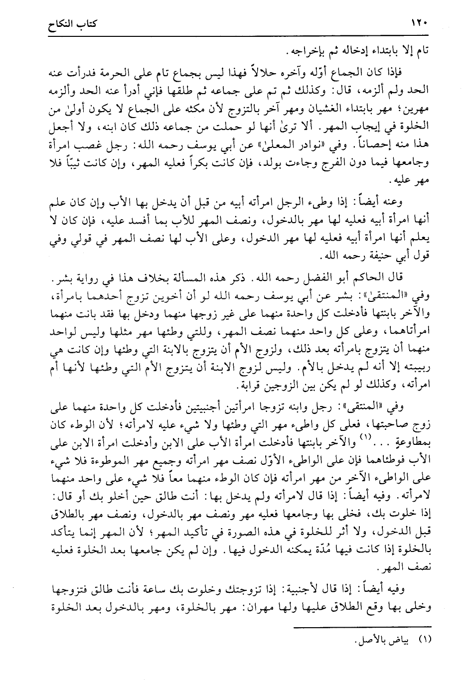 وفي «المنتقى» : رجل وابنه تزوجا امرأتين أجنبيتين فأدخلت كل واحدة منهما على زوج صاحبتها، فعلى كل واطىء مهر التي وطئها ولا شيء عليه لامرأته؛ لأن الوطء كان بمطاوعةٍ منها والآخر بابنتها فأدخلت امرأة الأب على الابن وأدخلت امرأة الابن على الأب فوطئاهما فإن على الواطىء الأوّل نصف مهر امرأته وجميع مهر الموطوءة فلا شيء على الواطىء الآخر من مهر امرأته فإن كان الوطء منهما معاً فلا شيء على واحد منهما لامرأته. وفيه أيضاً: إذا قال لامرأته ولم يدخل بها: أنت طالق حين أخلو بك أو قال: إذا خلوت بك، فخلى بها وجامعها فعليه مهر ونصف مهر بالدخول، ونصف مهر بالطلاق قبل الدخول، ولا أثر للخلوة في هذه الصورة في تأكيد المهر؛ لأن المهر إنما يتأكد بالخلوة إذا كانت فيها مُدّة يمكنه الدخول فيها. وإن لم يكن جامعها بعد الخلوة فعليه نصف المهر.