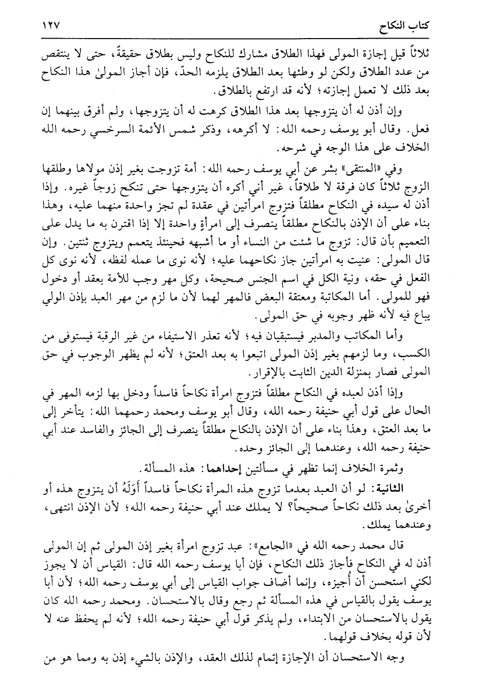 وفي «المنتقى» بشر عن أبي يوسف رحمه الله: أمة تزوجت بغير إذن مولاها وطلقها الزوج ثلاثاً كان فرقة لا طلاقاً، غير أني أكره أن يتزوجها حتى تنكح زوجاً غيره. وإذا أذن له سيده في النكاح مطلقاً فتزوج امرأتين في عقدة لم تجز واحدة منهما عليه، وهذا بناء على أن الإذن بالنكاح مطلقاً ينصرف إلى امرأةٍ واحدة إلا إذا اقترن به ما يدل على التعميم بأن قال: تزوج ما شئت من النساء أو ما أشبهه فحينئذ يتعمم ويتزوج ثنتين. وإن قال المولى: عنيت به امرأتين جاز نكاحهما عليه؛ لأنه نوى ما عمله لفظه، لأنه نوى كل الفعل في حقه، ونية الكل في اسم الجنس صحيحة، وكل مهر وجب للأمة بعقد أو دخول فهو للمولى. أما المكاتبة ومعتقة البعض فالمهر لهما لأن ما لزم من مهر العبد بإذن الولي يباع فيه لأنه ظهر وجوبه في حق المولى.