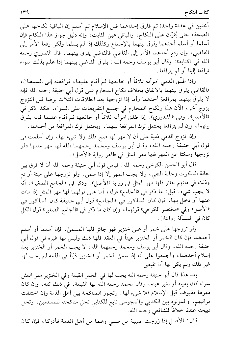 بعد هذا قال أبو حنيفة رحمه الله يجب لها في الخمر القيمة وفي الخنزير مهر المثل سواء كان بعينه أو بغير عينه، وقال محمد رحمه الله لها القيمة، في ذلك كله، وإن كان مهرها مقبوضاً قبل الإسلام فلا شيء لها. وتجوز المناكحة بين أهل الذمة وإن اختلفت مراتبهم، والمولود بين الكتابي والمجوسي تابع للكتابي تحل مناكحته للمسلمين، وتحل ذبيحته عندنا خلافاً للشافعي رحمه الله.