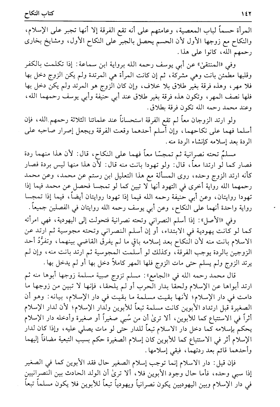 المرأة حسماً لباب المعصية، وعامتهم على أنه تقع الفرقة إلا أنها تجبر على الإسلام، والنكاح مع زوجها الأول لأن الحسم يحصل بالجبر على النكاح الأول، ومشايخ بخارى رحمهم الله، كانوا على هذا.