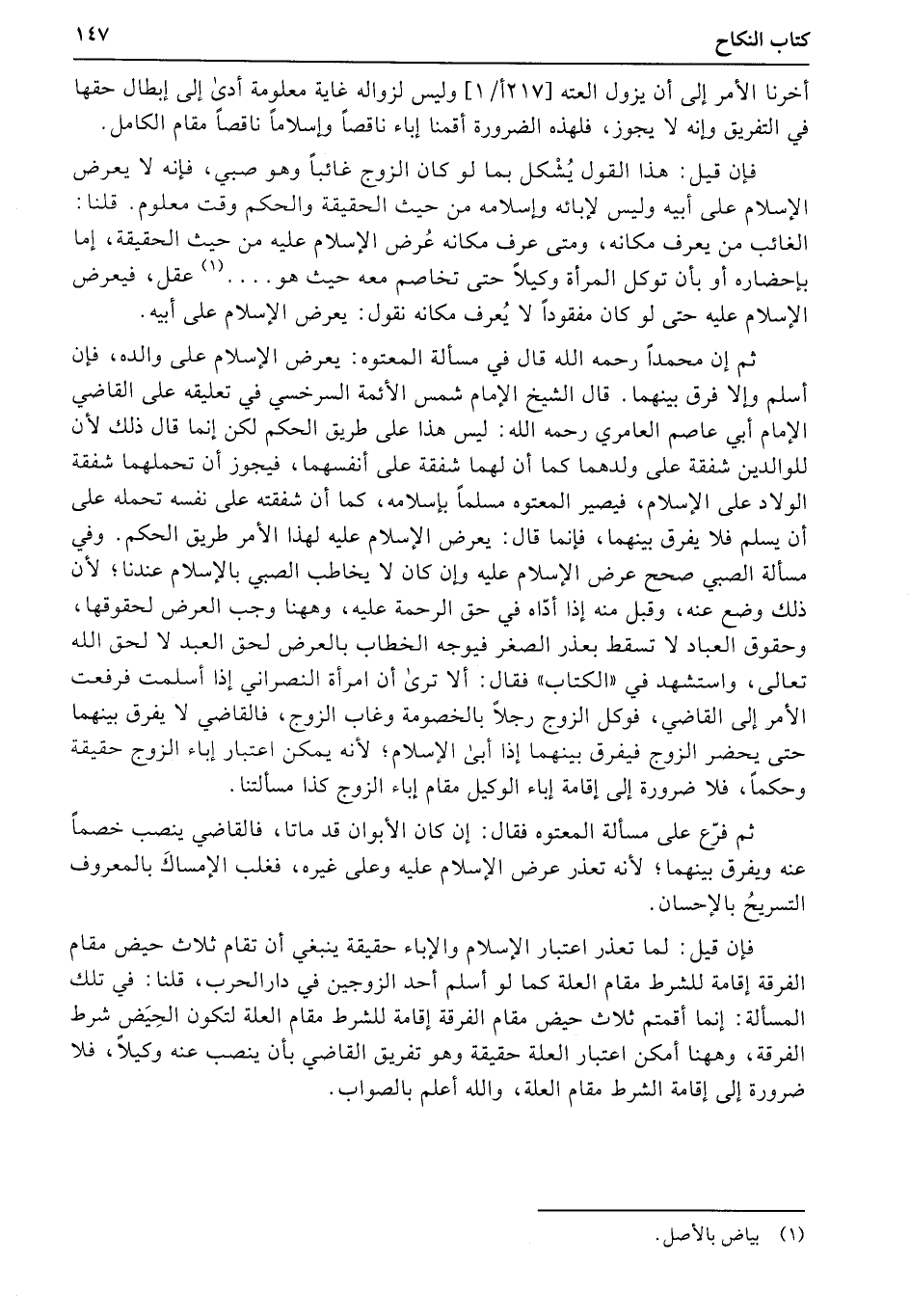 أخرنا الأمر إلى أن يزول العته (217أ1) وليس لزواله غاية معلومة أدى إلى إبطال حقها في التفريق وإنه لا يجوز، فلهذه الضرورة أقمنا إباء ناقصاً وإسلاماً ناقصاً مقام الكامل.