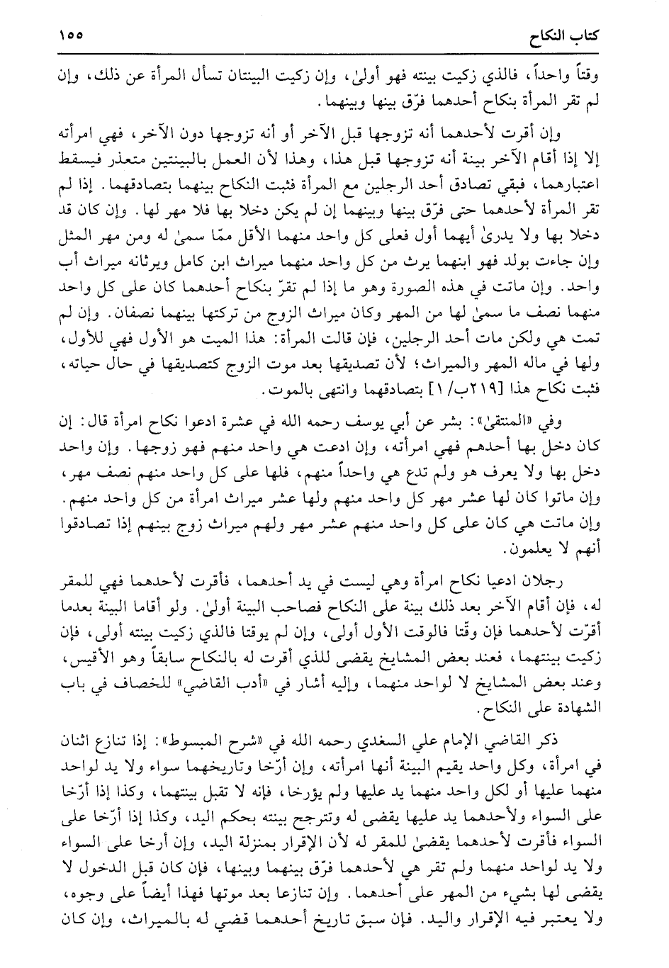رجلان ادعيا نكاح امرأة وهي ليست في يد أحدهما، فأقرت لأحدهما فهي للمقر له، فإن أقام الآخر بعد ذلك بينة على النكاح فصاحب البينة أولى. ولو أقاما البينة بعدما أقرّت لأحدهما فإن وقّتا فالوقت الأول أولى، وإن لم يوقتا فالذي زكيت بينته أولى، فإن زكيت بينتهما، فعند بعض المشايخ يقضى للذي أقرت له بالنكاح سابقاً وهو الأقيس، وعند بعض المشايخ لا لواحد منهما، وإليه أشار في «أدب القاضي» للخصاف في باب الشهادة على النكاح.