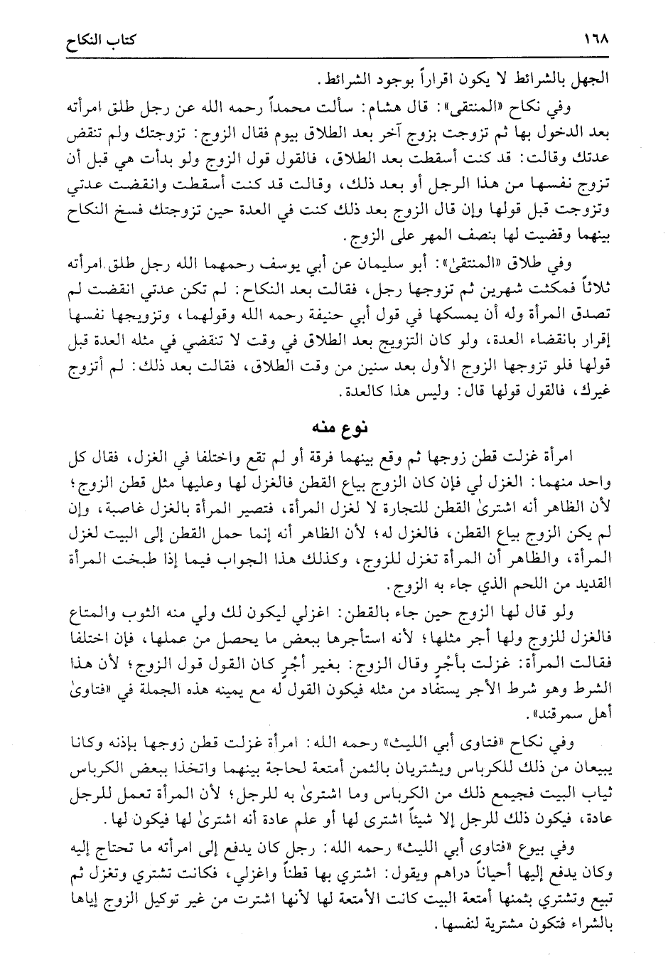 وفي نكاح «فتاوى أبي الليث» رحمه الله: امرأة غزلت قطن زوجها بإذنه وكانا يبيعان من ذلك للكرباس ويشتريان بالثمن أمتعة لحاجة بينهما واتخذا ببعض الكرباس ثياب البيت فجيمع ذلك من الكرباس وما اشترى به للرجل؛ لأن المرأة تعمل للرجل عادة، فيكون ذلك للرجل إلا شيئاً اشترى لها أو علم عادة أنه اشترى لها فيكون لها.
