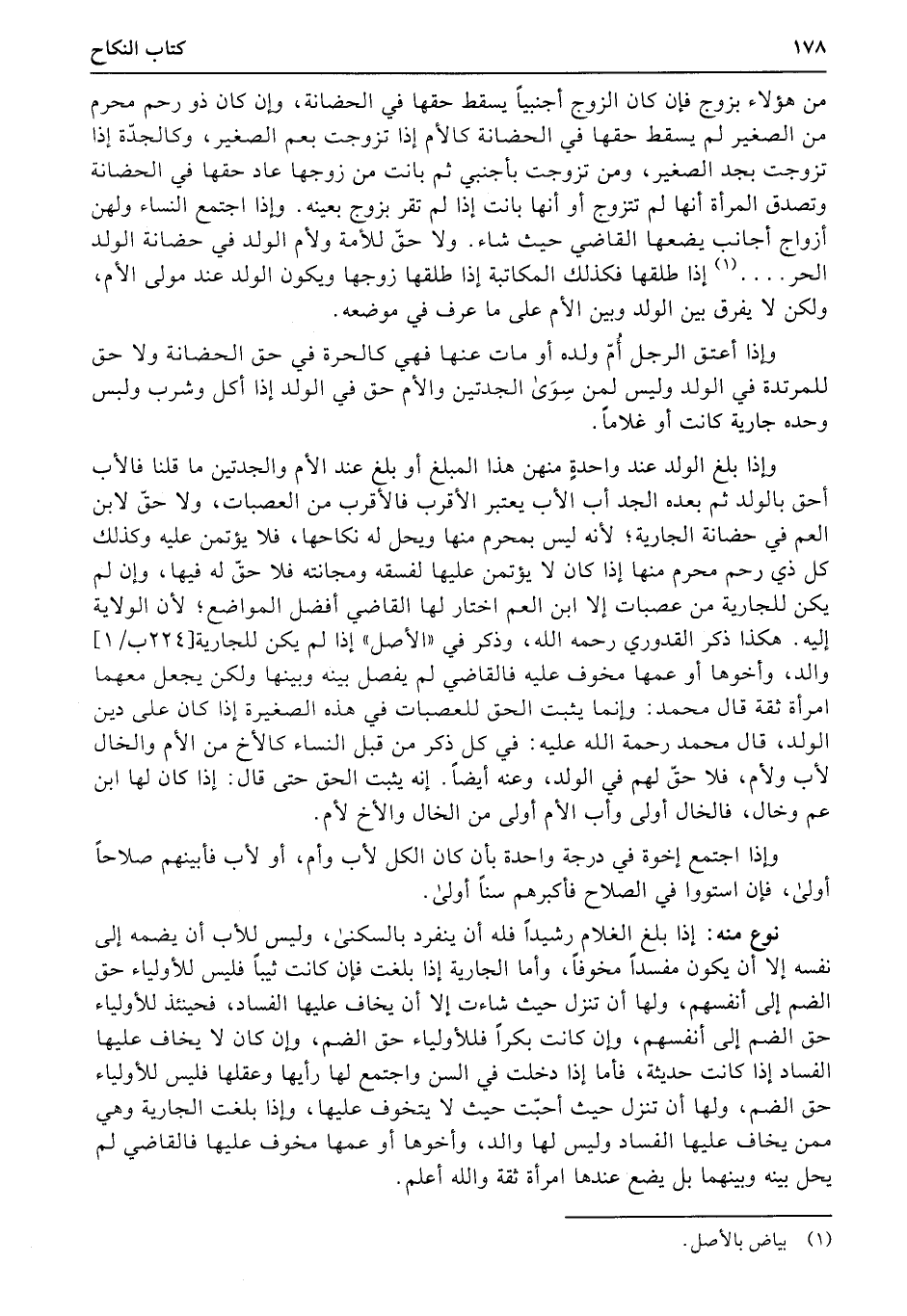 وإذا أعتق الرجل أُمّ ولده أو مات عنها فهي كالحرة في حق الحضانة ولا حق للمرتدة في الولد وليس لمن سِوَى الجدتين والأم حق في الولد إذا أكل وشرب ولبس وحده جارية كانت أو غلاماً.