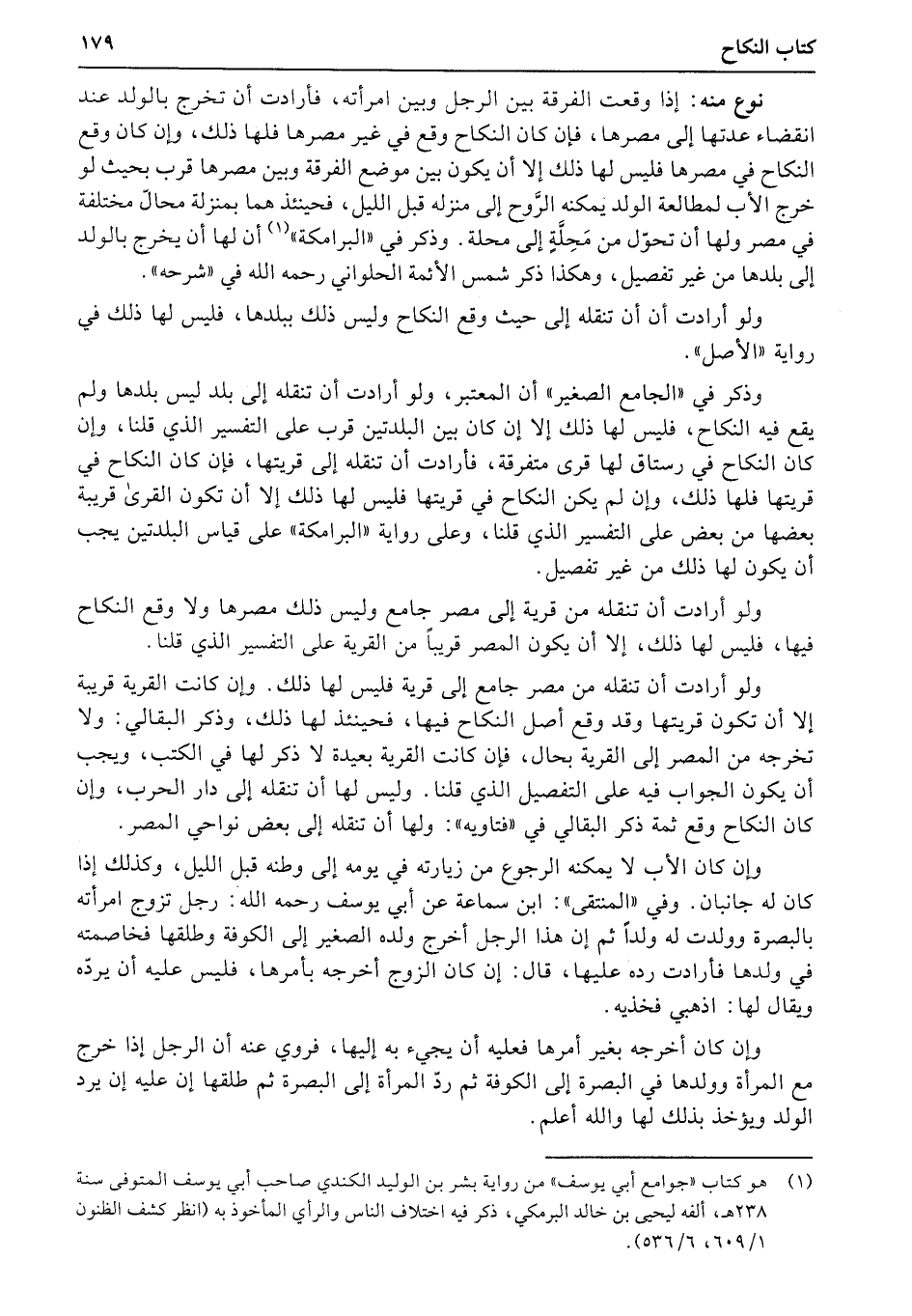 نوع منه: إذا وقعت الفرقة بين الرجل وبين امرأته، فأرادت أن تخرج بالولد عند انقضاء عدتها إلى مصرها، فإن كان النكاح وقع في غير مصرها فلها ذلك، وإن كان وقع النكاح في مصرها فليس لها ذلك إلا أن يكون بين موضع الفرقة وبين مصرها قرب بحيث لو خرج الأب لمطالعة الولد يمكنه الرَّوح إلى منزله قبل الليل، فحينئذ هما بمنزلة محالّ مختلفة في مصر ولها أن تحوّل من مَحِلَّةٍ إلى محلة. وذكر في «البرامكة» أن لها أن يخرج بالولد إلى بلدها من غير تفصيل، وهكذا ذكر شمس الأئمة الحلواني رحمه الله في «شرحه» .