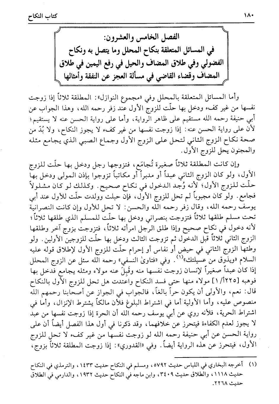 الفصل الخامس والعشرون: في المسائل المتعلقة بنكاح المحلل وما يتصل به ونكاح الفضولي في طلاق المضاف والحيل في رفع اليمين في طلاق المضاف وقضاء القاضي في مسألة العجز عن النفقة وأمثالها