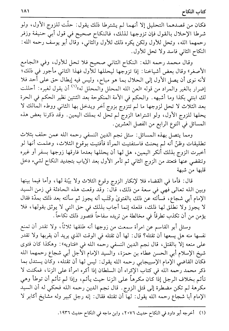 وقال محمد رحمه الله: النكاح الثاني صحيح فلا تحل للأول، وفي «الجامع الأصغر» وقال بعض أشياخنا: إذا تزوجها ليحللها للأول فهذا الثاني مأجور في ذلك؛ لأنه نوى أن يصل الأول إلى الحلال بما هو مباح، وليس فيه إبطال حق على أحد فلا إضرار بالغير والمراد من قوله «لعن الله المحلل والمحلل له» أن يقول لغيره: أحللت لك ابنتي بكذا وما أشبهه. والحكم في الأمة المنكوحة بعد الثنتين نظير الحكم في الحرة بعد الثلاث لا تحل لزوجها ما لم تتزوج بزوج آخر ويدخل بها الثاني ووطء المالك لا يحلها للزوج الأول، ولو اشتراها الزوج لم تحل له بملك اليمين. وقد ذكرنا بعض هذه المسائل في النوع الرابع من الفصل العشرين.