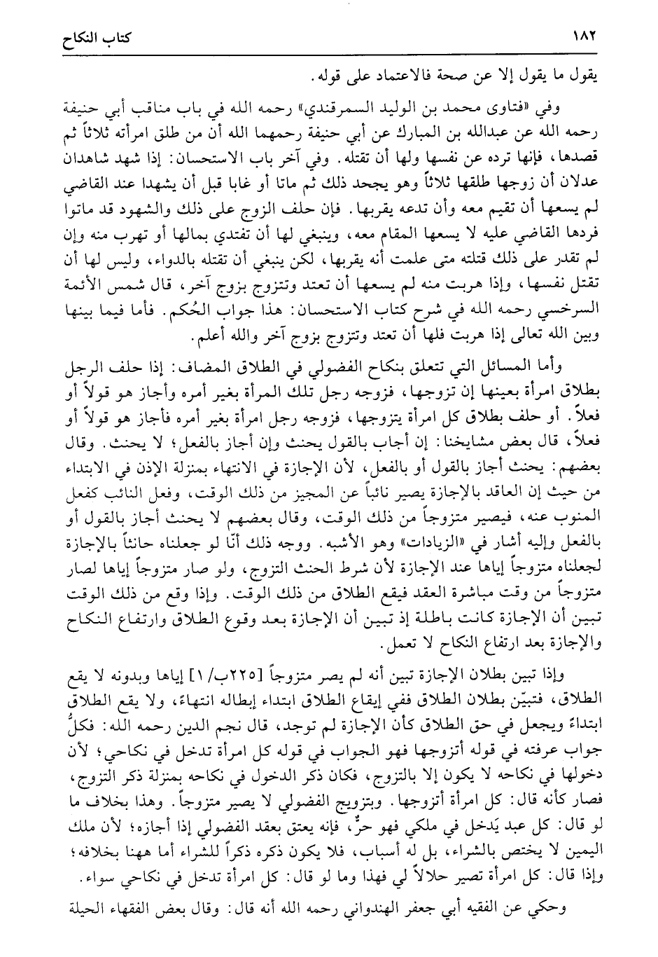 وأما المسائل التي تتعلق بنكاح الفضولي في الطلاق المضاف: إذا حلف الرجل بطلاق امرأة بعينها إن تزوجها، فزوجه رجل تلك المرأة بغير أمره وأجاز هو قولاً أو فعلاً. أو حلف بطلاق كل امرأة يتزوجها، فزوجه رجل امرأة بغير أمره فأجاز هو قولاً أو فعلاً، قال بعض مشايخنا: إن أجاب بالقول يحنث وإن أجاز بالفعل؛ لا يحنث. وقال بعضهم: يحنث أجاز بالقول أو بالفعل، لأن الإجازة في الانتهاء بمنزلة الإذن (في) الابتداء من حيث إن العاقد بالإجازة يصير نائباً عن المجيز من ذلك الوقت، وفعل النائب كفعل المنوب عنه، فيصير متزوجاً من ذلك الوقت، وقال بعضهم لا يحنث أجاز بالقول أو بالفعل وإليه أشار في «الزيادات» وهو الأشبه. ووجه ذلك أنّا لو جعلناه حانثاً بالإجازة لجعلناه متزوجاً إياها عند الإجازة لأن شرط الحنث التزوج، ولو صار متزوجاً إياها لصار متزوجاً من وقت مباشرة العقد فيقع الطلاق من ذلك الوقت. وإذا وقع من ذلك الوقت تبين أن الإجازة كانت باطلة إذ تبين أن الإجازة بعد وقوع الطلاق وارتفاع النكاح والإجازة بعد ارتفاع النكاح لا تعمل.