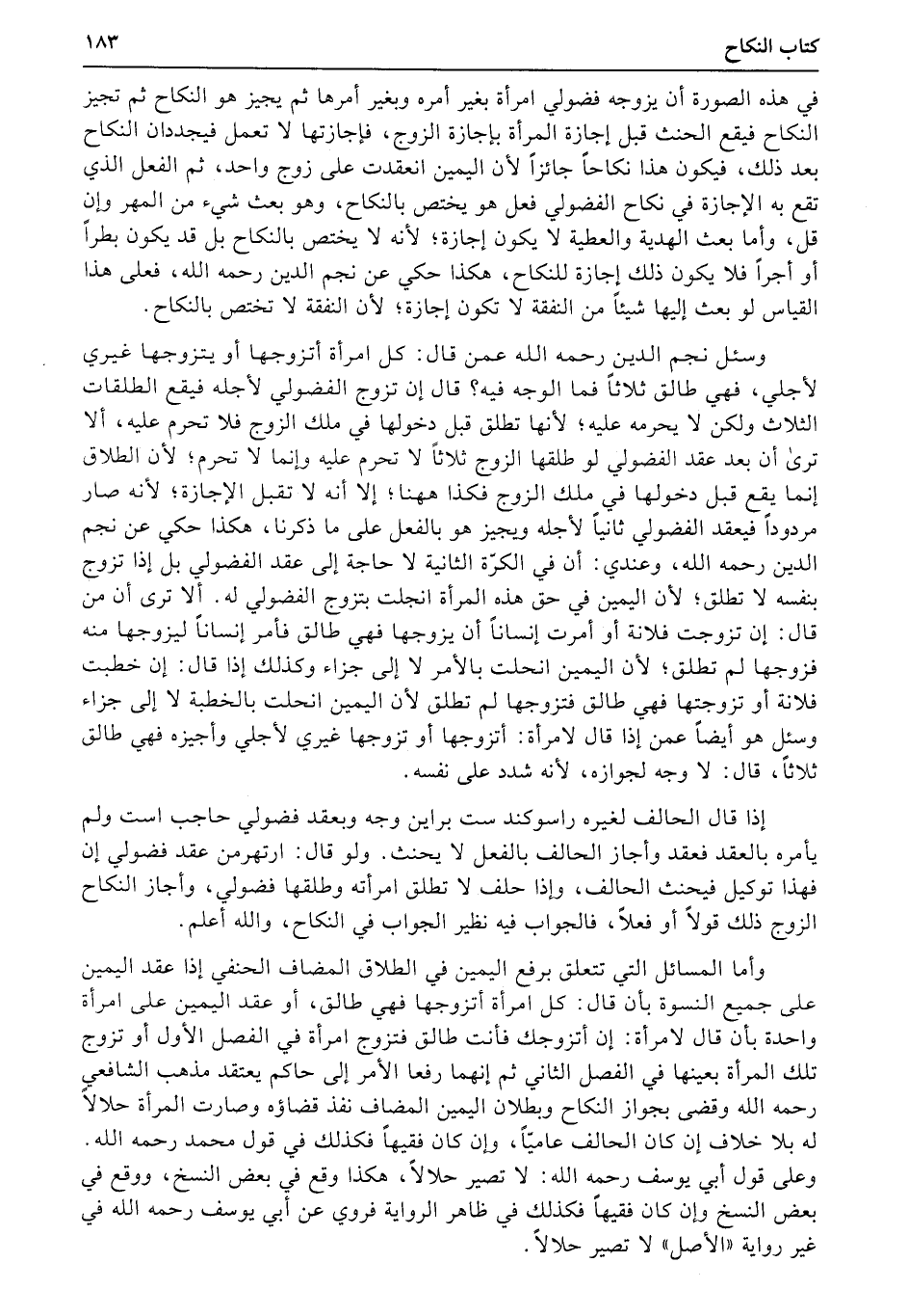 وسئل نجم الدين رحمه الله عمن قال: كل امرأة أتزوجها أو يتزوجها غيري لأجلي، فهي طالق ثلاثاً فما الوجه فيه؟ قال إن تزوج الفضولي لأجله فيقع الطلقات الثلاث ولكن لا يحرمه عليه؛ لأنها تطلق قبل دخولها في ملك الزوج فلا تحرم عليه، ألا ترى أن بعد عقد الفضولي لو طلقها الزوج ثلاثاً لا تحرم عليه وإنما لا تحرم؛ لأن الطلاق إنما يقع قبل دخولها في ملك الزوج فكذا ههنا؛ إلا أنه لا تقبل الإجازة؛ لأنه صار مردوداً فيعقد الفضولي ثانياً لأجله ويجيز هو بالفعل على ما ذكرنا، هكذا حكي عن نجم الدين رحمه الله، وعندي: أن في الكرّة الثانية لا حاجة إلى عقد الفضولي بل إذا تزوج بنفسه لا تطلق؛ لأن اليمين في حق هذه المرأة انجلت بتزوج الفضولي له. ألا ترى أن من قال: إن تزوجت فلانة أو أمرت إنساناً أن يزوجها فهي طالق فأمر إنساناً ليزوجها منه فزوجها لم تطلق؛ لأن اليمين انحلت بالأمر لا إلى جزاء وكذلك إذا قال: إن خطبت فلانة أو تزوجتها فهي طالق فتزوجها لم تطلق لأن اليمين انحلت بالخطبة لا إلى جزاء وسئل هو أيضاً عمن إذا قال لامرأة: أتزوجها أو تزوجها غيري لأجلي وأجيزه فهي طالق ثلاثاً، قال: لا وجه لجوازه، لأنه شدد على نفسه.