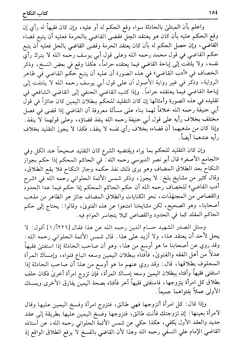 وإن كان التقليد للحكم بما يراه ويقتضيه الشرع كان التقليد صحيحاً عند الكل وفي «الجامع الأصغر» قال أبو نصر الدبوسي رحمه الله: في الحاكم المحكم إذا حكم بجواز النكاح بعد الطلاق المضاف وهو يرى ذلك نفذ حكمه وجاز النكاح فلا يقع الطلاق، وقال كثير من مشايخ بلخ: لا يجوز، وذكر شمس الأئمة الحلواني رحمه الله في «شرح أدب القاضي» للخصاف رحمه الله أن حكم الحاكم المحكم إذا حكم فيما عدا الحدود والقصاص من المجتهَدَات، نحو الكنايات والطلاق المضاف جائز هو الظاهر من مذهب أصحابنا، وهو الصحيح، لكن مشايخنا امتنعوا عن هذه الفتوى، وقالوا: يحتاج إلى حكم الحاكم المقلد كما في الحدود والقصاص كيلا يتجاسر العوام فيه.