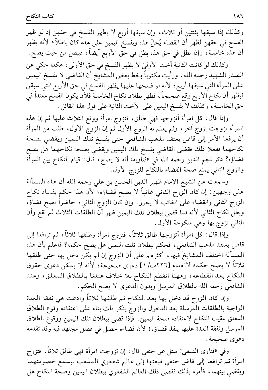 وفي «فتاوى النسفي» سئل عن حنفي قال: إن تزوجت امرأة فهي طالق ثلاثاً، فتزوج امرأة ثم ترافعا إلى قاض حنفي فبعثها إلى عالم شفعوي المذهب ليسمع خصومتهما ويقضي بينهما، فأمره بذلك فقضى ذلك العالم الشفعوي ببطلان اليمين وصحة النكاح هل