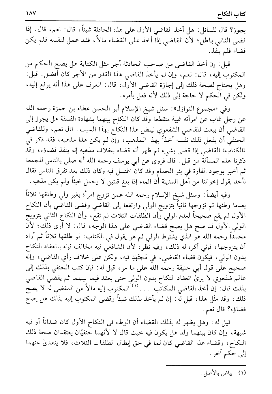 وفيه أيضاً: وسئل شيخ الإسلام رحمه الله عمن تزوج امرأة بغير ولي وطلقها ثلاثاً بعدما وطئها ثم تزوجها ثانياً بتزويج الولي وارتفعا إلى القاضي وقضى القاضي بأن النكاح الأول لم يقع صحيحاً لعدم الولي وأن الطلقات الثلاث لم تقع، وأن النكاح الثاني بتزويج الولي الأول قد صح هل يصح قضاء القاضي على هذا الوجه، قال: لا أرى ذلك؛ لأن محمداً رحمه الله هو الذي يشترط الولي ثم هو يقول في الكتاب: لو طلقها ثلاثاً ثم أراد أن يتزوجها، فإني أكره له ذلك، وفيه نظر، لأن الشافعي فيه مخالف فإنه بانعقاد النكاح بدون الولي، فيكون قضاء القاضي، في مُجتَهَدٍ فيه، ولكن على خلاف رأي القاضي، وإنه صحيح على قول أبي حنيفة رحمه الله على ما مر، قيل له: فإن كتب الحنفي بذلك إلى عالم شفعوي لا يرى انعقاد النكاح بدون الولي حتى يعقد فيما بينهما ثم يقضي القاضي بذلك قال: إن أخذ القاضي المكاتب.... المكتوب إليه مالاً من المقضي له لا يصح ذلك، وقد مثّل هذا، قيل له: إن لم يأخذ بذلك شيئاً وقضى المكتوب إليه بذلك هل يصح قضاؤه؟ قال نعم.