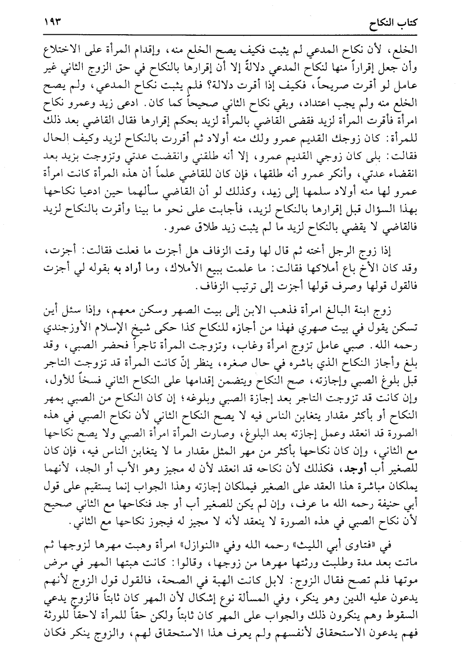الخلع، لأن نكاح المدعي لم يثبت فكيف يصح الخلع منه، وإقدام المرأة على الإختلاع وأن جعل إقراراً منها لنكاح المدعي دلالةً إلا أن إقرارها بالنكاح في حق الزوج الثاني غير عامل لو أقرت صريحاً، فكيف إذا أقرت دلالة؟ فلم يثبت نكاح المدعي، ولم يصح الخلع منه ولم يجب اعتداد، وبقي نكاح الثاني صحيحاً كما كان. ادعى زيد وعمرو نكاح امرأة فأقرت المرأة لزيد فقضى القاضي بالمرأة لزيد بحكم إقرارها فقال القاضي بعد ذلك للمرأة: كان زوجك القديم عمرو ولك منه أولاد ثم أقررت بالنكاح لزيد وكيف الحال فقالت: بلى كان زوجي القديم عمرو، إلا أنه طلقني وانقضت عدتي وتزوجت بزيد بعد انقضاء عدتي، وأنكر عمرو أنه طلقها، فإن كان للقاضي علماً أن هذه المرأة كانت امرأة عمرو لها منه أولاد سلمها إلى زيد، وكذلك لو أن القاضي سألهما حين ادعيا نكاحها بهذا السؤال قبل إقرارها بالنكاح لزيد، فأجابت على نحو ما بينا وأقرت بالنكاح لزيد فالقاضي لا يقضي بالنكاح لزيد ما لم يثبت زيد طلاق عمرو.