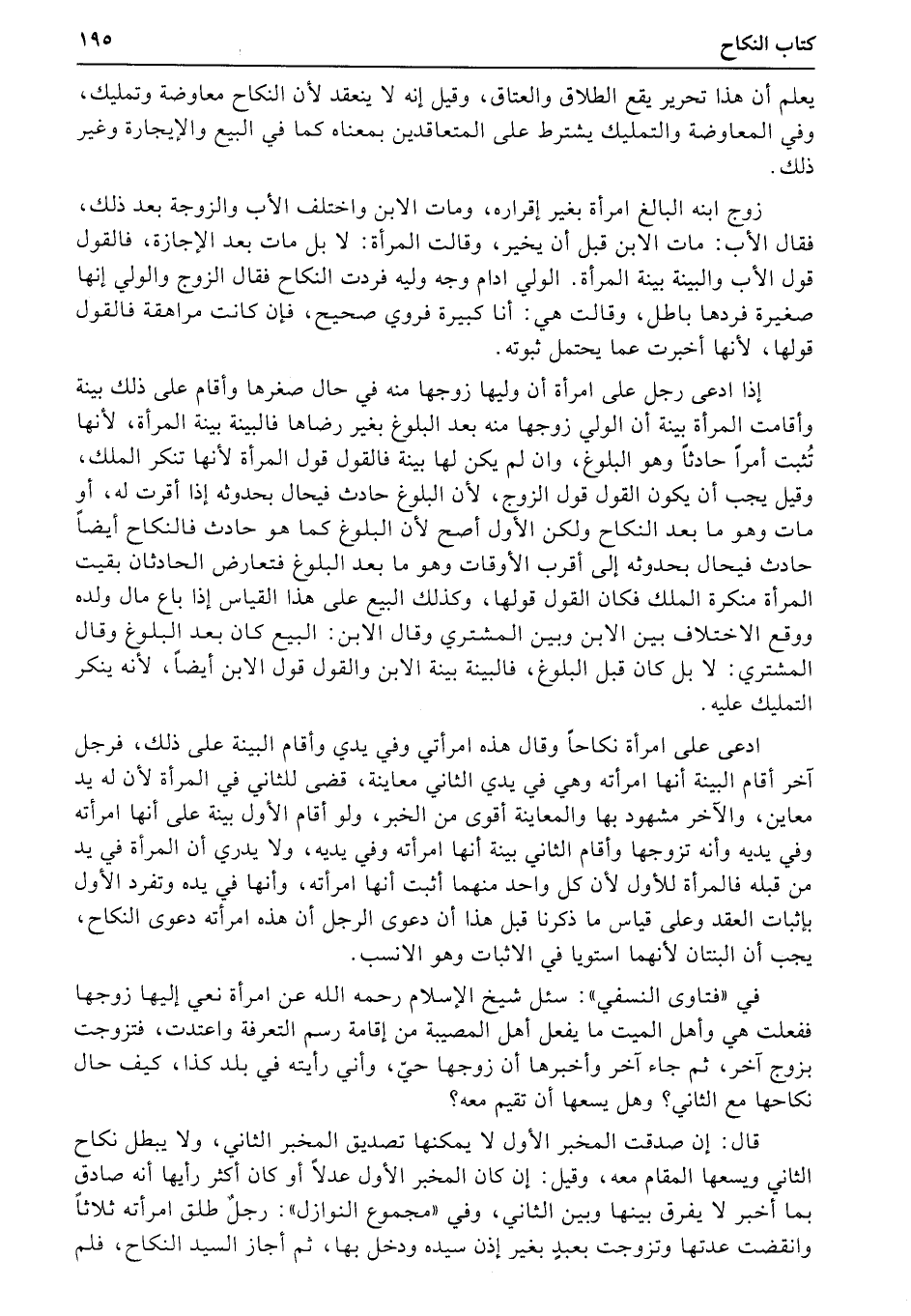 إذا ادعى رجل على امرأة أن وليها زوجها منه في حال صغرها وأقام على ذلك بينة وأقامت المرأة بينة أن الولي زوجها منه بعد البلوغ بغير رضاها فالبينة بينة المرأة، لأنها تُثبت أمراً حادثاً وهو البلوغ، وان لم يكن لها بينة فالقول قول المرأة لأنها تنكر الملك، وقيل يجب أن يكون القول قول الزوج، لأن البلوغ حادث فيحال بحدوثه إذا أقرت له، أو مات وهو ما بعد النكاح ولكن الأول أصح لأن البلوغ كما هو حادث فالنكاح أيضاً حادث فيحال بحدوثه إلى أقرب الأوقات وهو ما بعد البلوغ فتعارض الحادثان بقيت المرأة منكرة الملك فكان القول قولها، وكذلك البيع على هذا القياس إذا باع مال ولده ووقع الاختلاف بين الابن وبين المشتري وقال الابن: البيع كان بعد البلوغ وقال المشتري: لا بل كان قبل البلوغ، فالبينة بينة الابن والقول قول الابن أيضاً، لأنه ينكر التمليك عليه.