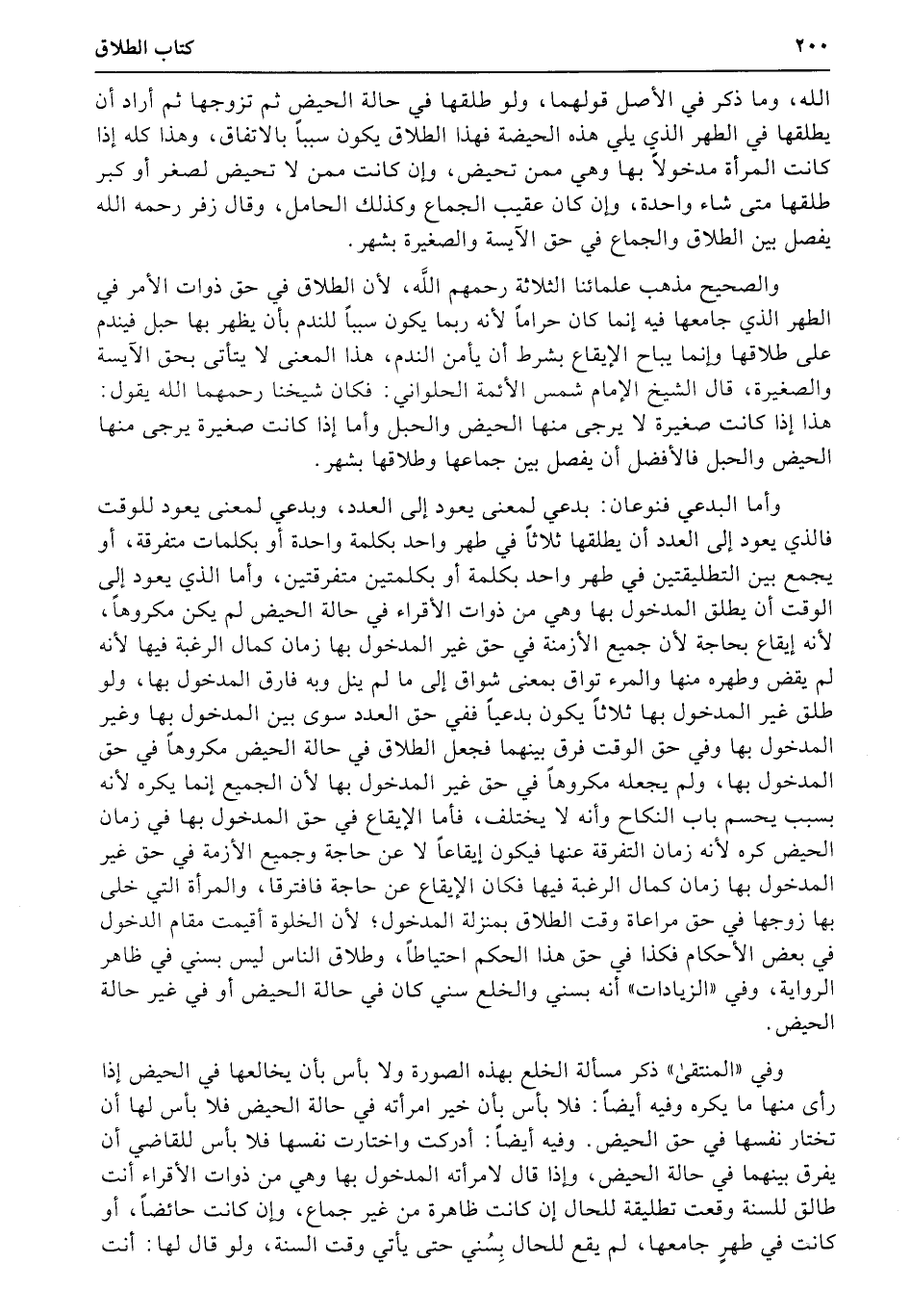 وأما البدعي فنوعان: بدعي لمعنى يعود إلى العدد، بدعي لمعنى يعود للوقت فالذي يعود إلى العدد أن يطلقها ثلاثاً في طهر واحد بكلمة واحدة أو بكلمات متفرقة، أو يجمع بين التطليقتين في طهر واحد بكلمة أو بكلمتين متفرقتين، وأما الذي يعود إلى الوقت أن يطلق المدخول بها وهي من ذوات الأقراء في حالة الحيض لم يكن مكروهاً، لأنه إيقاع بحاجة لأن جميع الأزمنة في حق غير المدخول بها زمان كمال الرغبة فيها لأنه لم يقض وطهره منها والمرء تواق بمعنى شواق إلى ما لم ينل وبه فارق المدخول بها، ولو طلق غير المدخول بها ثلاثاً يكون بدعياً ففي حق العدد سوى بين المدخول بها وغير المدخول بها وفي حق الوقت فرق بينهما فجعل الطلاق في حالة الحيض مكروهاً في حق المدخول بها، ولم يجعله مكروهاً في حق غير المدخول بها لأن الجميع إنما يكره لأنه بسبب يحسم باب النكاح وأنه لا يختلف، فأما الإيقاع في حق المدخول بها في زمان الحيض كره لأنه زمان التفرقة عنها فيكون إيقاعاً لا عن حاجة وجميع الأزمة في حق غير المدخول بها زمان كمال الرغبة فيها فكان الإيقاع عن حاجة فافترقا، والمرأة التي خلى بها زوجها في حق مراعاة وقت الطلاق بمنزلة المدخول؛ لأن الخلوة أقيمت مقام الدخول في بعض الأحكام فكذا في حق هذا الحكم احتياطاً، وطلاق الناس ليس بسني في ظاهر الرواية، وفي «الزيادات» أنه بسني والخلع سني كان في حالة الحيض أو في غير حالة الحيض.