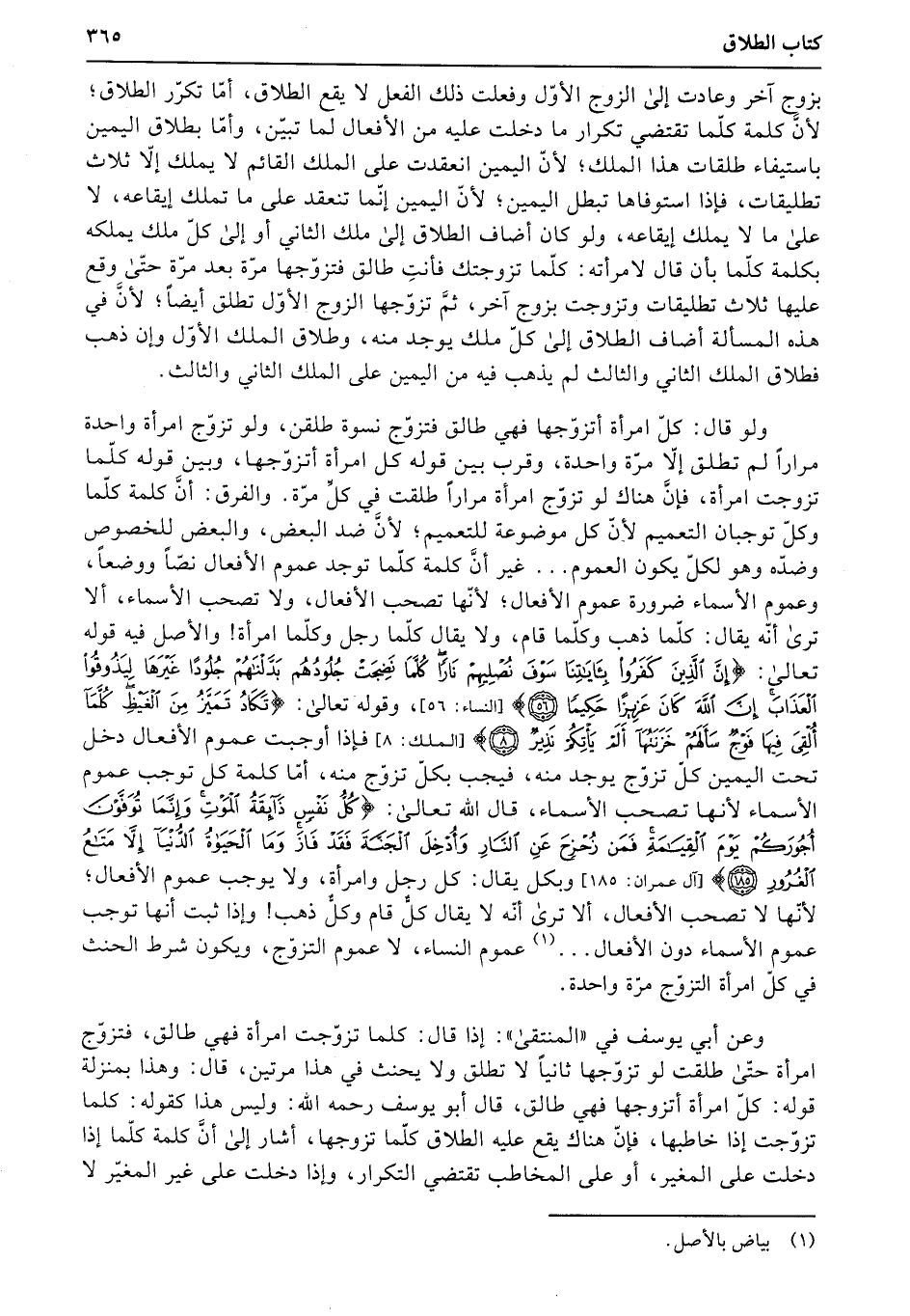 ولو قال: كلّ امرأة أتزوّجها فهي طالق فتزوّج نسوة طلقن، ولو تزوّج امرأة واحدة مراراً لم تطلق إلا مرّة واحدة، وقرب بين قوله كل امرأة أتزوّجها، وبين قوله كلّما تزوجت امرأة، فإنَّ هناك لو تزوّج امرأة مراراً طلقت في كلِّ مرّة. والفرق: أنَّ كلمة كلّما وكلّ توجبان التعميم لأنّ كل موضوعة للتعميم؛ لأنَّ ضد البعض، والبعض للخصوص وضدّه وهو لكلّ يكون العموم ... غير أنَّ كلمة كلّما توجد عموم الأفعال نصّاً ووضعاً، وعموم الأسماء ضرورة عموم الأفعال؛ لأنّها تصحب الأفعال، ولا تصحب الأسماء، ألا ترى أنّه يقال: كلّما ذهب وكلّما قام، ولا يقال كلّما رجل وكلّما امرأة والأصل فيه قوله تعالى: {إِنَّ الَّذِينَ كَفَرُواْ بِئَايَتِنَا سَوْفَ نُصْلِيهِمْ نَاراً كُلَّمَا نَضِجَتْ جُلُودُهُمْ بَدَّلْنَهُمْ جُلُوداً غَيْرَهَا لِيَذُوقُواْ الْعَذَابَ إِنَّ اللَّهَ كَانَ عَزِيزاً حَكِيماً} (النساء: 56) ، وقوله تعالى: {تَكَادُ تَمَيَّزُ مِنَ الغَيْظِ كُلَّمَا أُلْقِىَ فِيهَا فَوْجٌ سَأَلَهُمْ خَزَنَتُهَآ أَلَمْ يَأْتِكُمْ نَذِيرٌ} (الملك: 8) فإذا أوجبت عموم الأفعال دخل تحت اليمين كلّ تزوّج يوجد منه، فيجب بكلّ تزوّج منه، أمّا كلمة كل توجب عموم الأسماء لأنها تصحب الأسماء، قال الله تعالى: {كُلُّ نَفْسٍ ذَآئِقَةُ الْمَوْتِ وَإِنَّمَا تُوَفَّوْنَ أُجُورَكُمْ يَوْمَ الْقِيَمَةِ فَمَن زُحْزِحَ عَنِ النَّارِ وَأُدْخِلَ الْجَنَّةَ فَقَدْ فَازَ وَما الْحَيَوةُ الدُّنْيَا إِلاَّ مَتَعُ الْغُرُورِ} (آل عمران: 185) وبكل يقال: كل رجل وامرأة، ولا يوجب عموم الأفعال؛ لأنّها لا تصحب الأفعال، ألا ترى أنّه لا يقال كلٌّ قام وكلٌّ ذهب وإذا ثبت أنها توجب عموم الأسماء دون الأفعال ... عموم النساء، لا عموم التزوّج، ويكون شرط الحنث في كلّ امرأة التزوّج مرّة واحدة.