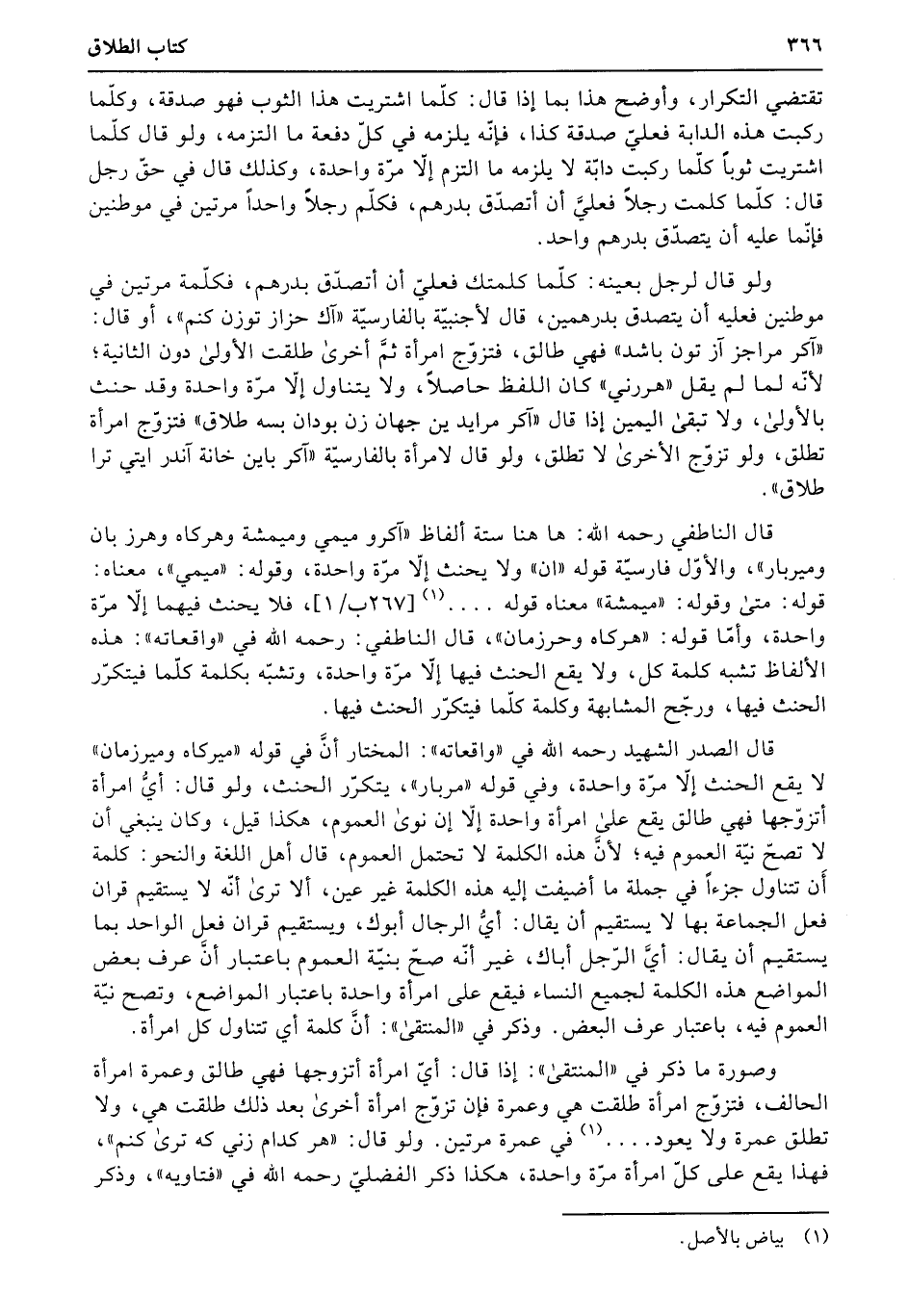 قال الناطقي رحمه الله: ها هنا ستة ألفاظ «آكرو ميمي وميمشة وهركاه وهرز بان وميربار» ، والأوّل فارسيّة قوله «ان» ولا يحنث إلا مرّة واحدة، وقوله: «ميمي» ، معناه: قوله: متى وقوله: «ميمشة» معناه قوله.... (267ب1) ، فلا يحنث فيهما إلا مرّة واحدة، وأمّا قوله: «هركاه وحرزمان» ، قال الناطفي: رحمه الله في «واقعاته» : هذه الألفاظ تشبه كلمة كل، ولا يقع الحنث فيها إلا مرّة واحدة، وتشبّه بكلمة كلّما فيتكرّر الحنث فيها، ورجّح المشابهة وكلمة كلّما فيتكرّر الحنث فيها.6