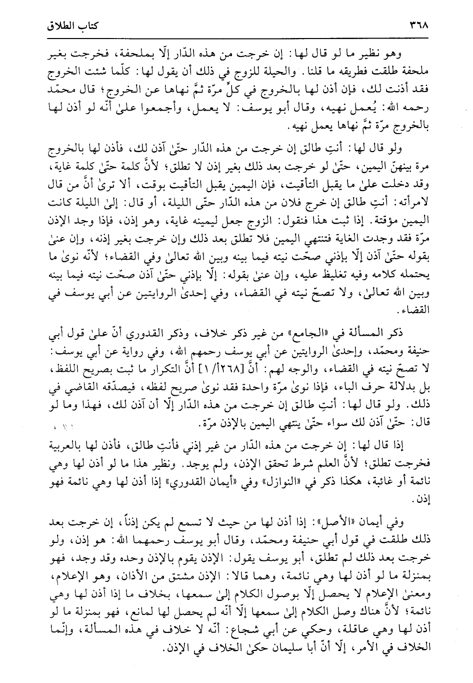 ولو قال لها: أنتِ طالق إن خرجت من هذه الدّار حتّى آذن لك، فأذن لها بالخروج مرة بينهنّ اليمين، حتّى لو خرجت بعد ذلك بغير إذن لا تطلق؛ لأنَّ كلمة حتّى كلمة غاية، وقد دخلت على ما يقبل التأقيت، فإن اليمين يقبل التأقيت بوقت، ألا ترى أنَّ من قال لامرأته: أنتِ طالق إن خرج فلان من هذه الدّار حتّى الليلة، أو قال: إلى الليلة كانت اليمين مؤقتة. إذا ثبت هذا فنقول: الزوج جعل ليمينه غاية، وهو إذن، فإذا وجد الإذن مرّة فقد وجدت الغاية فتنتهي اليمين فلا تطلق بعد ذلك وإن خرجت بغير إذنه، وإن عنى بقوله حتّى آذن إلا بإذني صحّت نيته فيما بينه وبين الله تعالى وفي القضاء؛ لأنّه نوى ما يحتمله كلامه وفيه تغليظ عليه، وإن عنى بقوله: إلا بإذني حتّى آذن صحّت نيته فيما بينه وبين الله تعالى، ولا تصحّ نيته في القضاء، وفي إحدى الروايتين عن أبي يوسف في القضاء.
