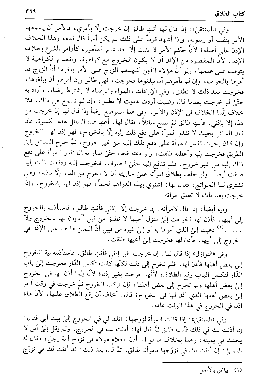 وفيه أيضاً: إذا قال لامرأته: إن خرجت إلا بإذني فأنتِ طالق، فاستأذنيه بالخروج إلى أبيها، فأذن لها فخرجت إلى منزل أخيها لا تطلق من قبل أنّه إذن لها بالخروج ولا..... ذهبت إلى الذي أمرها به أو إلى غيره من قبيل أنَّ اليمين ها هنا على الإذن في الخروج إلى أبيها، فأذن لها فخرجت إلى أخيها طلقت.