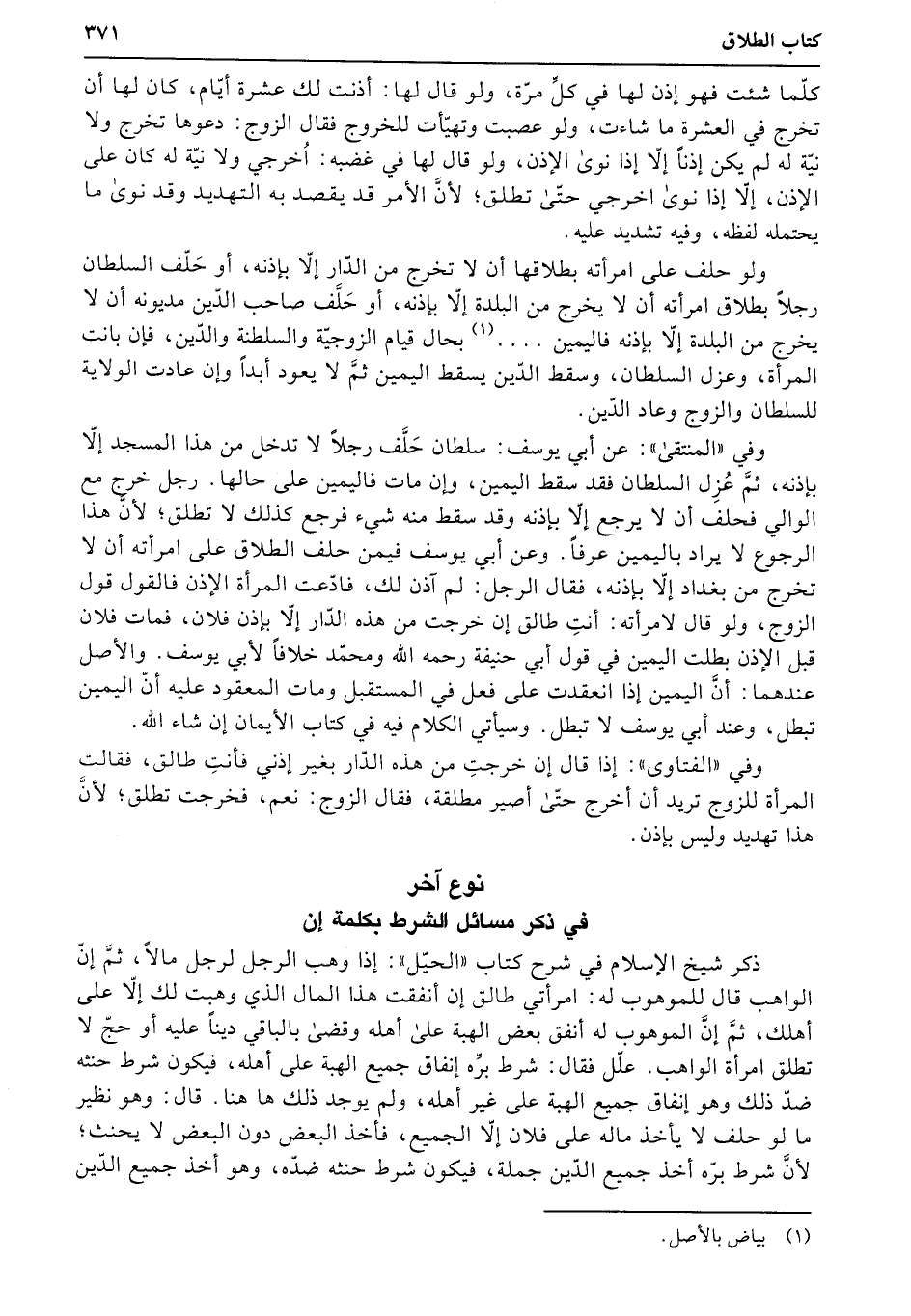 ولو حلف على امرأته بطلاقها أن لا تخرج من الدّار إلا بإذنه، أو حَلّف السلطان رجلاً بطلاق امرأته أن لا يخرج من البلدة إلا بإذنه، أو حَلَّف صاحب الدّين مديونه أن لا يخرج من البلدة إلا بإذنه فاليمين.... بحال قيام الزوجيّة والسلطنة والدّين، فإن بانت المرأة، وعزل السلطان، وسقط الدّين يسقط اليمين ثمَّ لا يعود أبداً وإن عادت الولاية للسلطان والزوج وعاد الدّين.